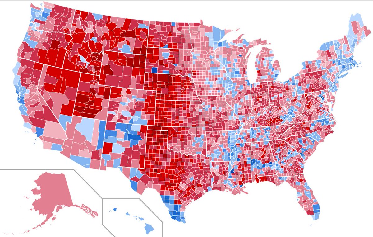 Here is the same map in "Trend" form, so county changes are RELATIVE to the large 30 pt Democratic swing nationally. Most urban areas outside the South trended Dem over the past century, while most rural areas have trended GOP, with a few exceptions on the West Coast/Midwest/NE: