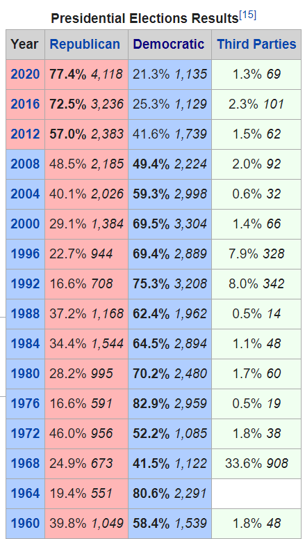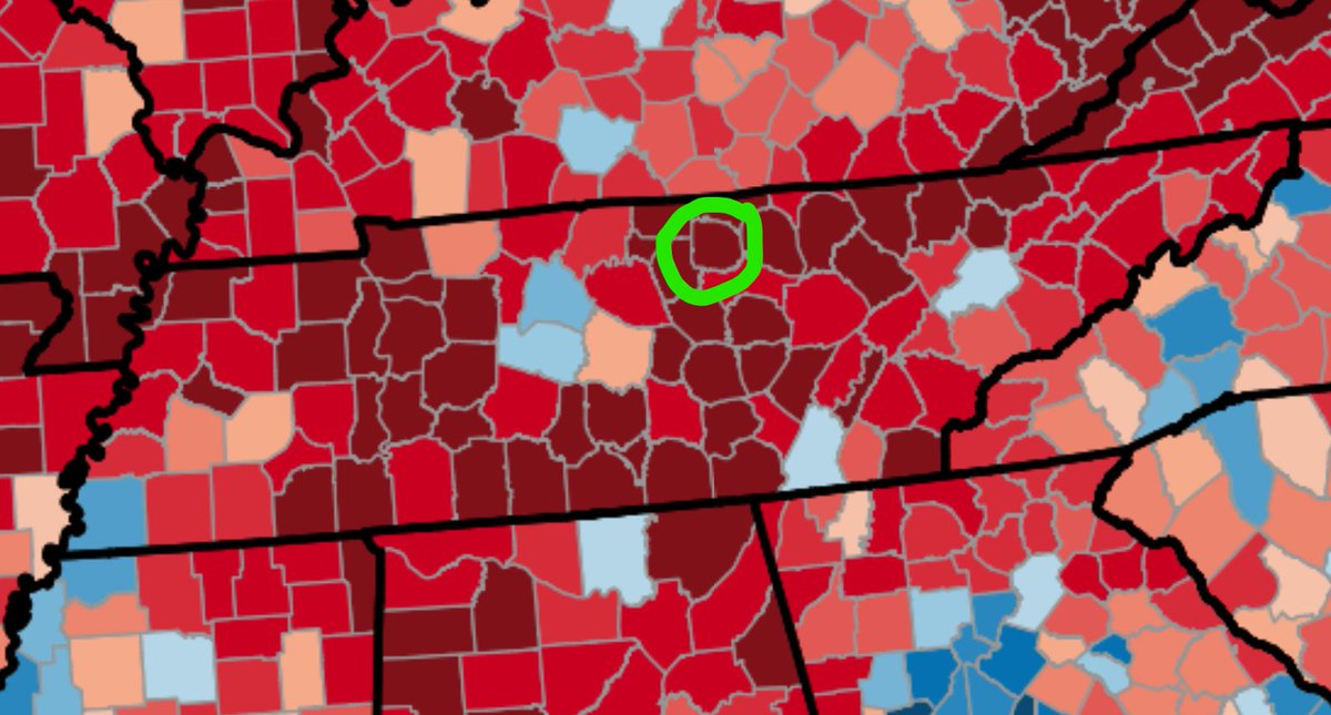 The biggest GOP swing was in Jackson County TN, which voted 70-29 for favorite son Al Gore over George W Bush in 2000, but flipped to 77-21 for Trump over Biden in 2020, a 96 pt swing! Jackson County TN is 95.9% White, much higher % than the state of TN which is only 74.5% White.