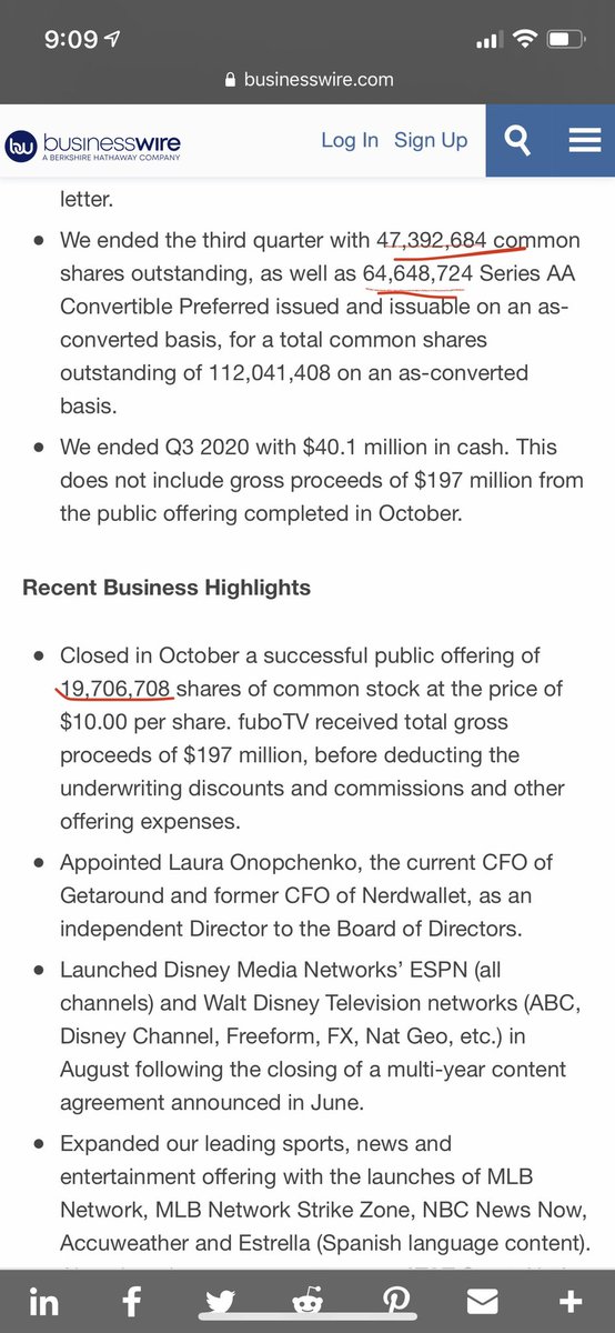 3) $fubo mrkt cap on every platform is listed @ 3.5B however that’s not accurate. The latest filing shows outstanding share count is not 65M as shown on brokerage sites but 132M + 4.6M warrants at 4.65/share!This company is over 2x as expensive as ppl think @ 8B+ mrkt cap already