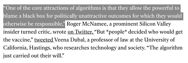 Parfois, ces "algorithmes très complexes" se plantent dans les grandes largeurs (ou révèlent les biais inavouables de leurs concepteurs) : exemple à l'hôpital de Stanford, où seuls 7 soignants sur 1300 ont été priorisés pour le vaccin.