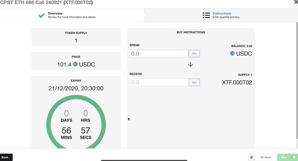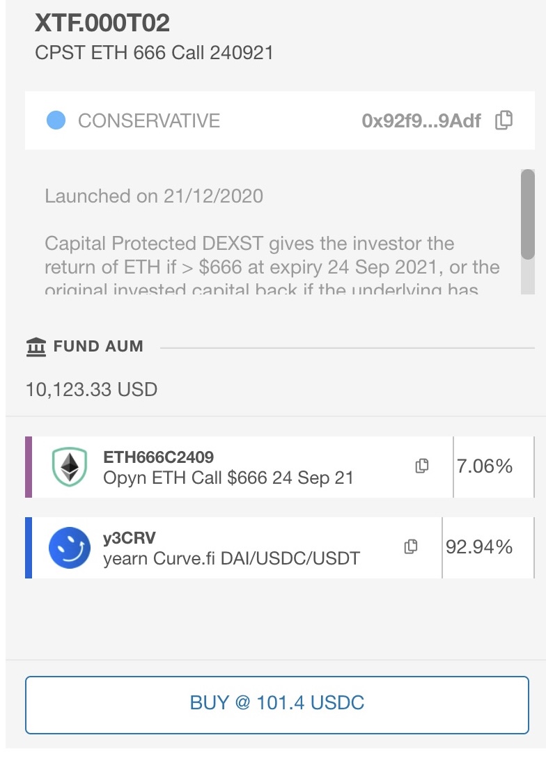 This new SFT is built using the yield generating ycurve and an Opyn call option on ETH with strike $666 and expiry on 24 September 2021 and will have a floor at $100 and initial price at $101.