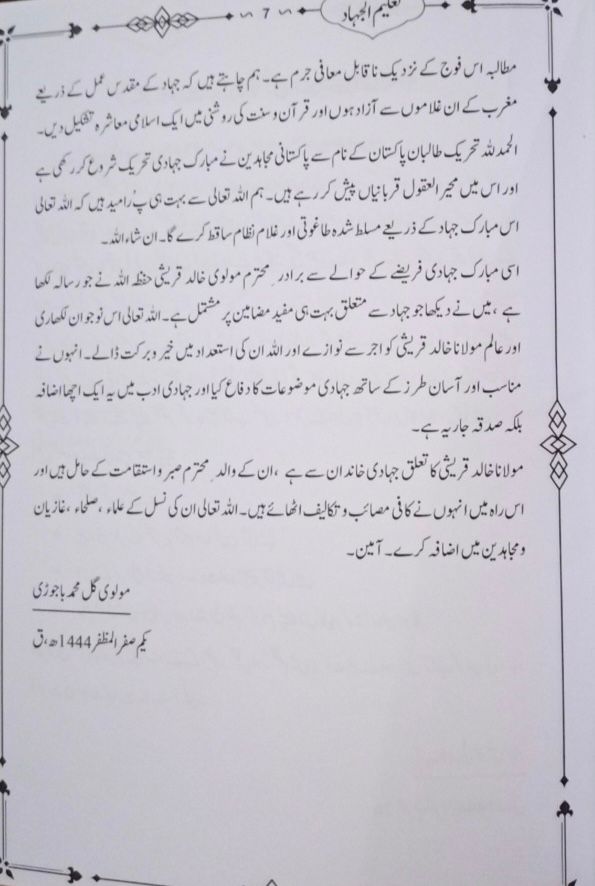 It is the first time TTP has produced such a purpose book. However, the book is not released by the TTP official Umar Media, but its senior ideologues, Sheikh Gul Muhammad Bajauri among others have recommended it as compulsory reading for the militants. 3/4