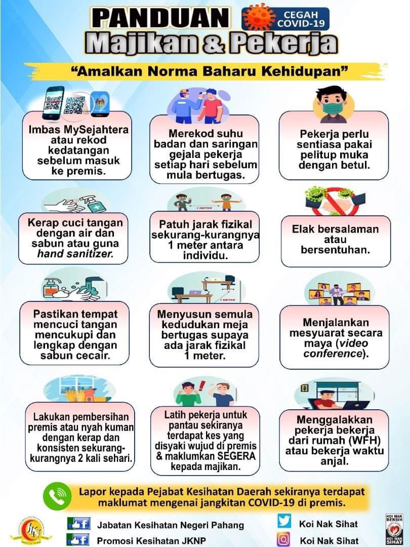 ๐ธKita perlu memastikan bahawa amalan kehidupan mengikut norma baharu ini diteruskan selagi wujud ancaman wabak Covid-19 ini. Patuhi panduan majikan dan pekerja seperti yang disarankan berikut:
