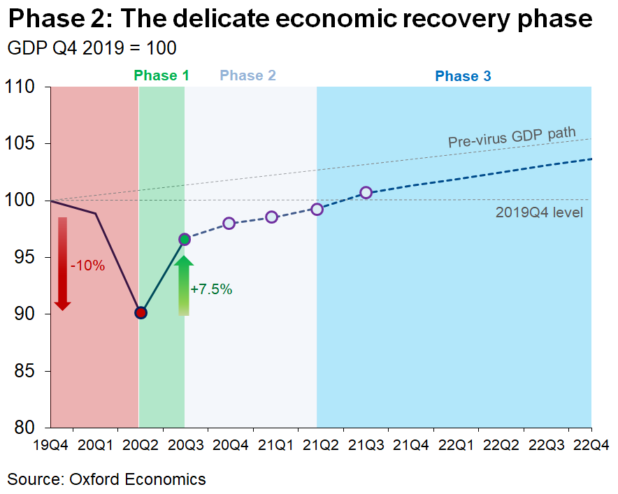 Our @OxfordEconomics baseline anticipates a gradual and uneven relaxation of social distancing measures through the summer such that #GDP and consumer spending are unlikely to return to their Q4 2019 level until mid-2021 – roughly 15-18 months after the initial #COVID19 shock.
