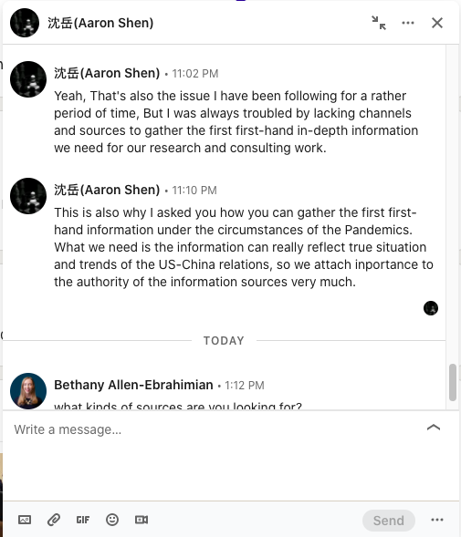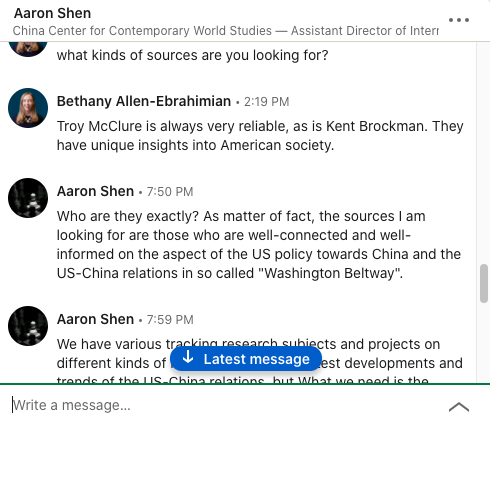 Aaron Shen (沈岳 in Chinese) sent me a request to connect on LinkedIn. He claimed to be the assistant director of international liaison at the China Center for Contemporary World Studies — the in-house think tank of the International Department of the Chinese Communist.
