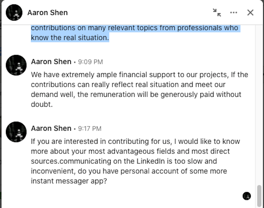 BUT! Aaron Shen, or whoever was really behind that LinkedIn profile, was almost stupidly inept.