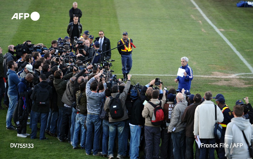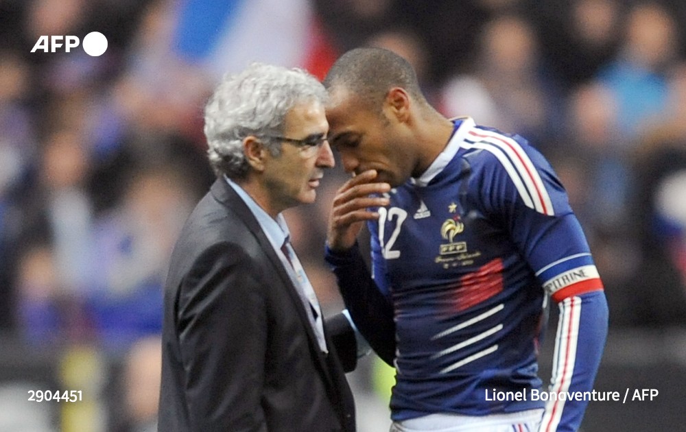 Aveugle à la faillite de ses cadres en 2008 et au conflit de générations avec quelques jeunes (Benzema, Nasri), il promet de "chasser les ego" en Afrique du Sud, où les Bleus arrivent encore escortés par le parfum du scandale de la main de Thierry Henry en barrages #AFP