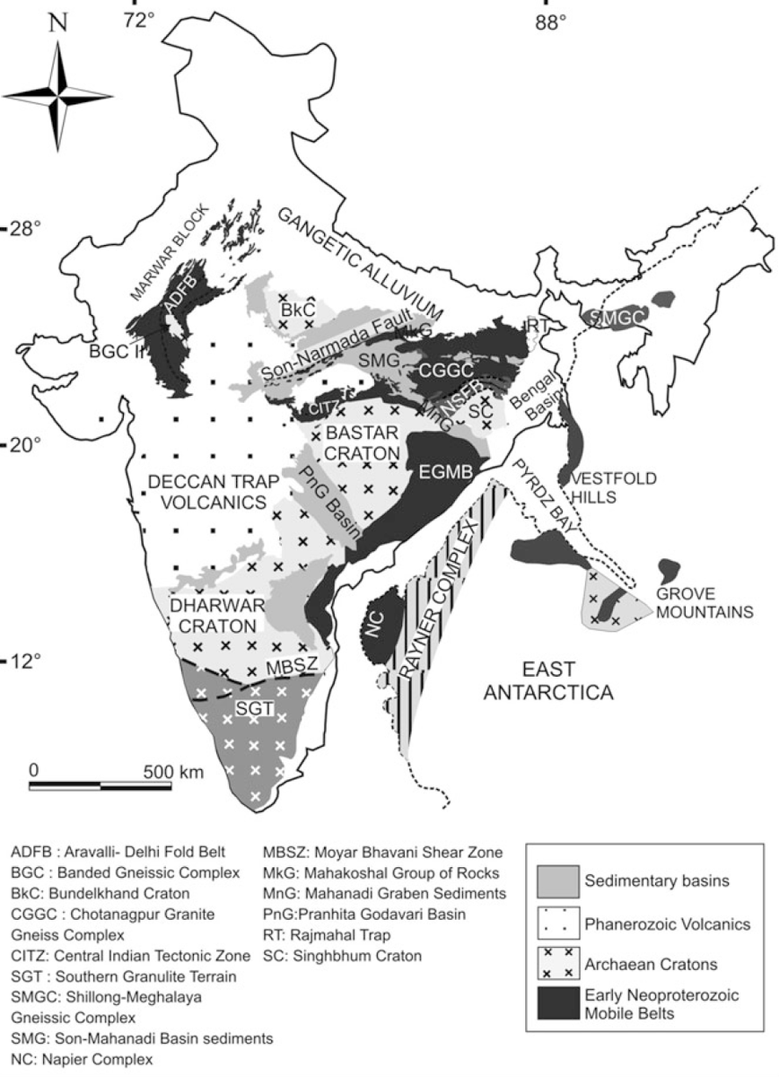 The blues are sedimentary rocks. The light blue are Gondwana sedimentations in valleys of Godavari, Mahanadi and Damodar from ~65 mya.