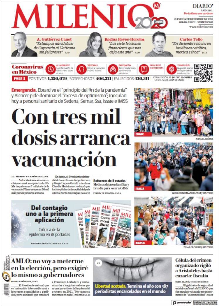 En el mundo se han aplicado 3.31 millones de vacunas hasta hoy, de las cuales EUA aplicó 1.01 millones de dosis, seguido por China con 1 millón y Reino Unido con 800,000 con datos de Our World in Data