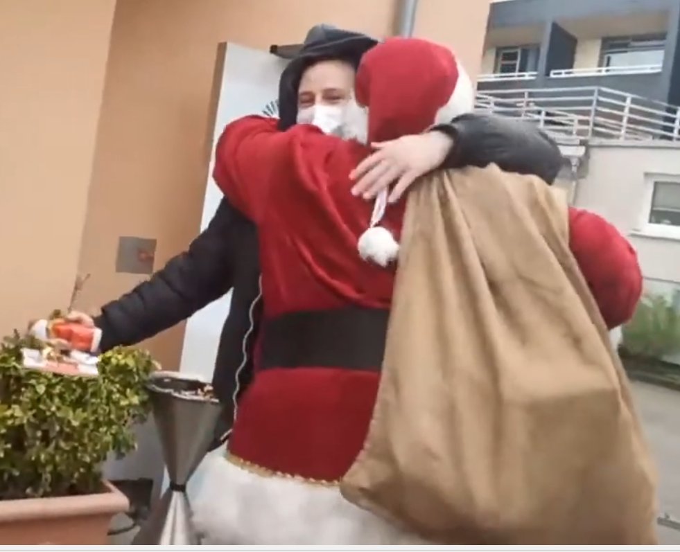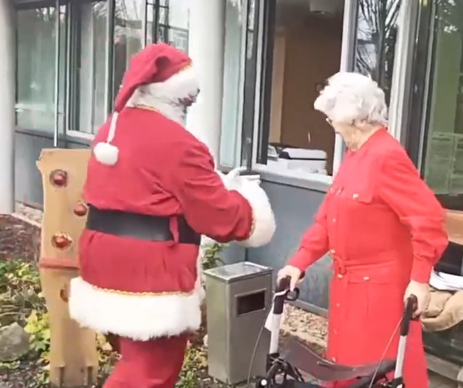 Hier umarmt der Querdenken-Weihnachtsmann einen Pfleger, der in einem Seniorenheim arbeitet.