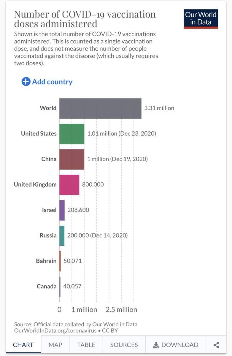 En el mundo se han aplicado 3.31 millones de vacunas hasta hoy, de las cuales EUA aplicó 1.01 millones de dosis, seguido por China con 1 millón y Reino Unido con 800,000 con datos de Our World in Data