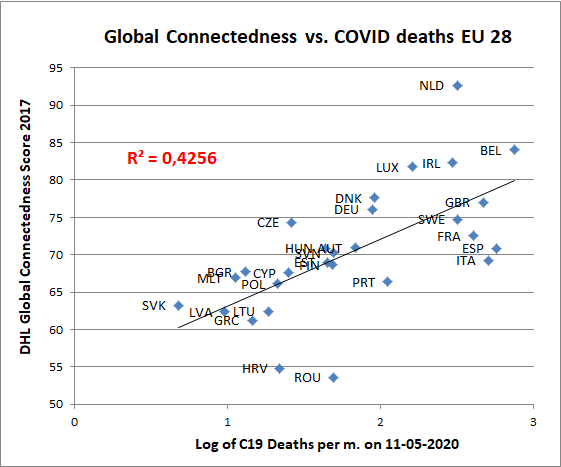 ... DHL connectedness index. Still, it has a very large correlation. Imagine using a better description of conn. (land daily intl. migrations) and accounting for one-offs, like 1 m. Swedes going for holidays last week in Feb. (an old chart of mine, but you get the point).