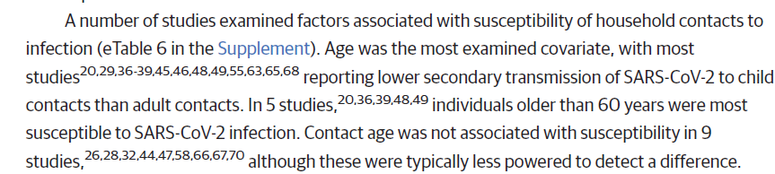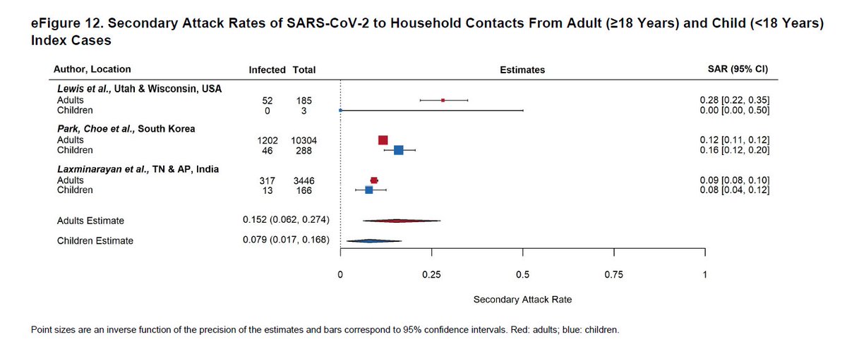5/n D'après cette méta-analyse, les adultes sont plus contaminateurs que les enfants (enfants étant entendu comme moins de 18 à 20 ans). On peut dire aussi que les enfants sont 50% moins contaminants. Cette proportn est certainemt moindre chez les + petits.