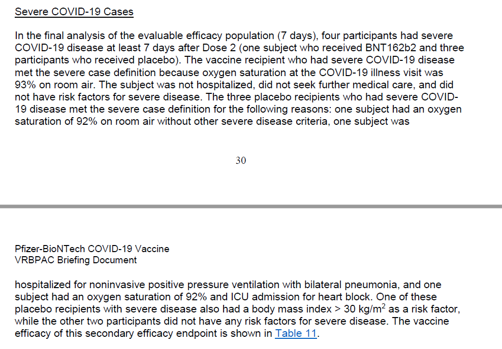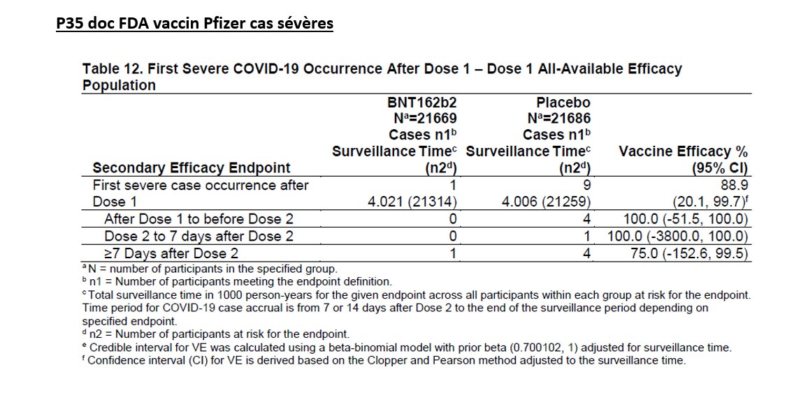 16/n On trouvait aussi une efficacité sur les cas sévères, à condition de considérer que les cas sévères se définissaient par le taux de saturation en oxygène et n'étaient pas nécessairement hospitalisés et à condition de prendre en compte les cas survenus après la 1ère dose.
