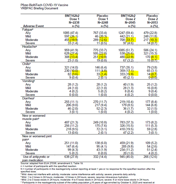 42/n Les effets indésirables systémiques (non locaux) classés comme "modérés" par Pfizer peuvent interférer avec les activités de la vie quotidienne.