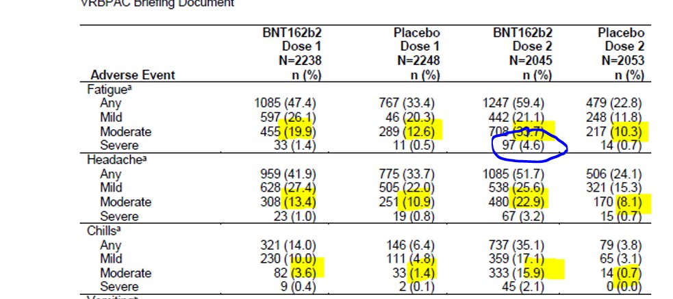 43/n Or, on voit que les effets indésirables modérés à sévères (empêchant toute activité), non seulement existent mais peuvent être de fréquents (>1%) à très fréquents (>10%) et surtout lr fréqc augmente bp lors de la deuxième dose, d'un facteur 3 à 10.