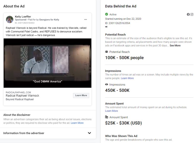 3. Loeffler has paid Facebook at least $25,000 to spread this lie which Facebook has accepted and in return as many as 500K Georgia voters have seen this false ad.