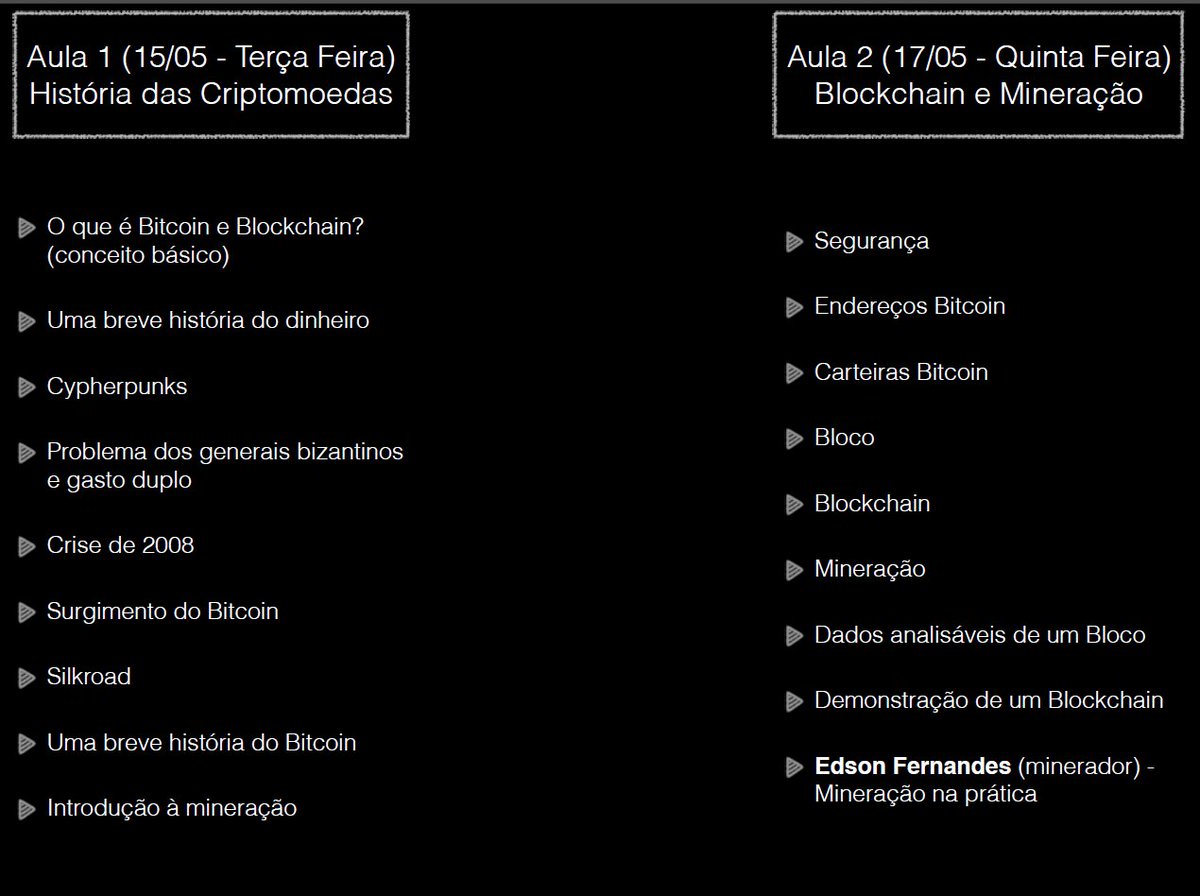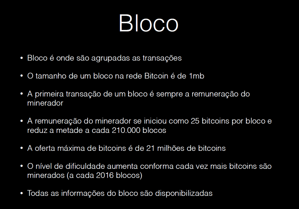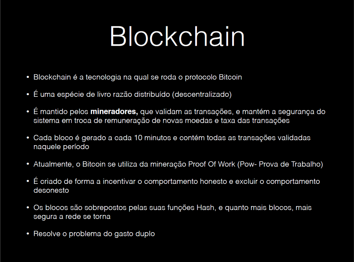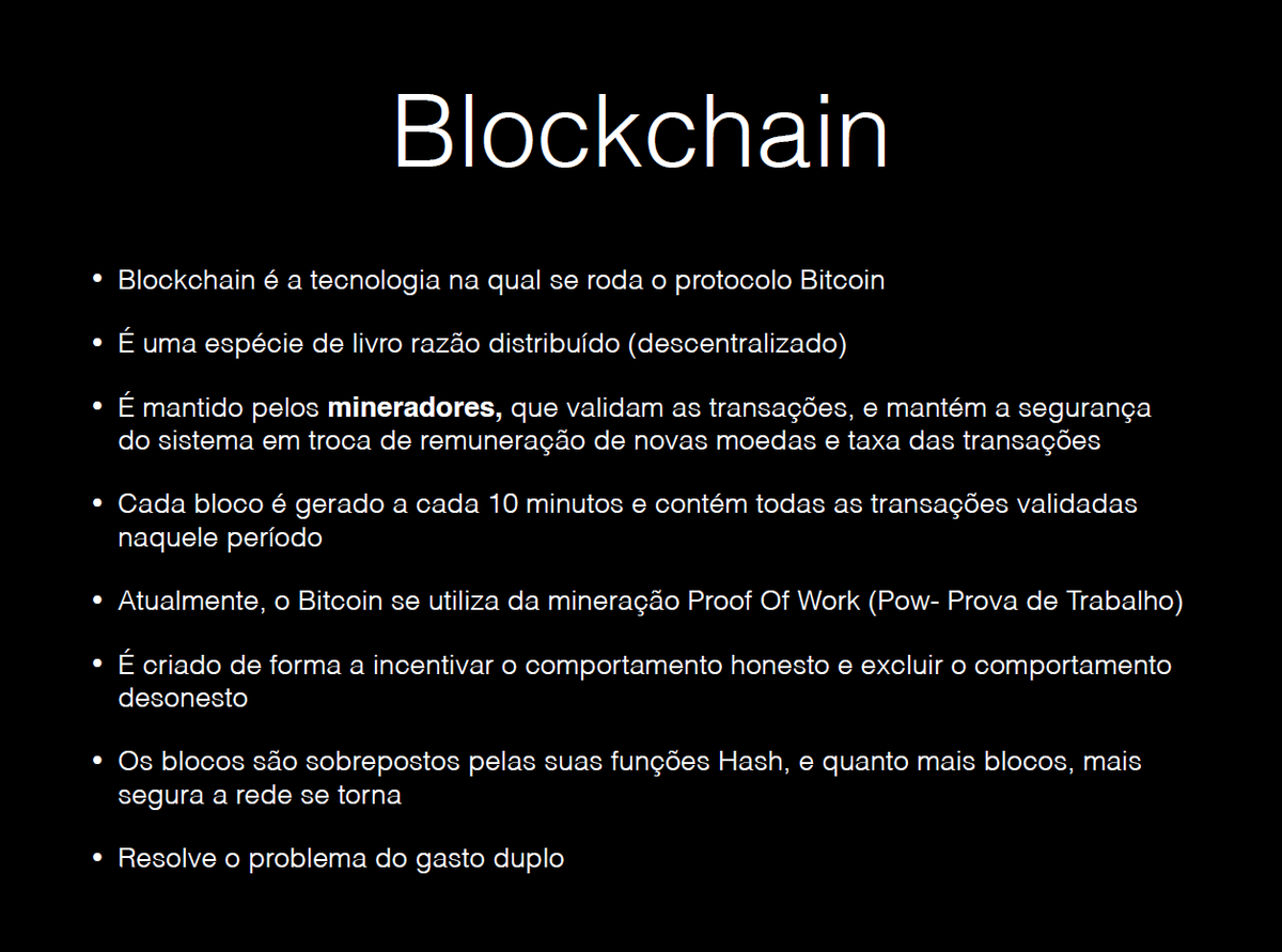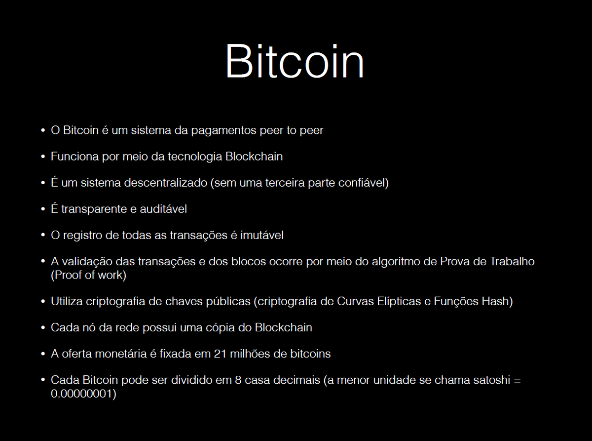 30) Vamos falar detalhadamente sobre cada tópico, mas pra matar um pouco da curiosidade de vocês, aqui está um resumo do que é o Bitcoin e o que é Blockchain (a tecnologia na qual a rede Bitcoin funciona)