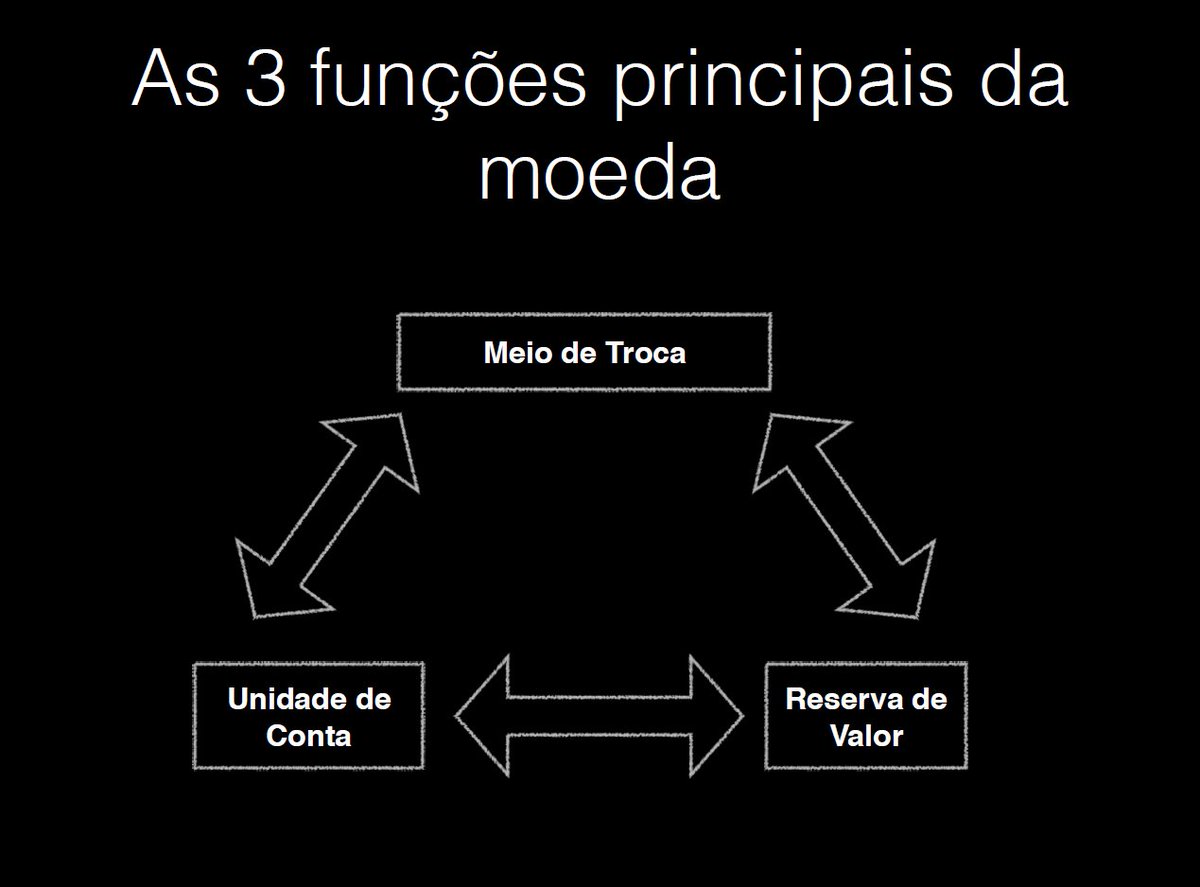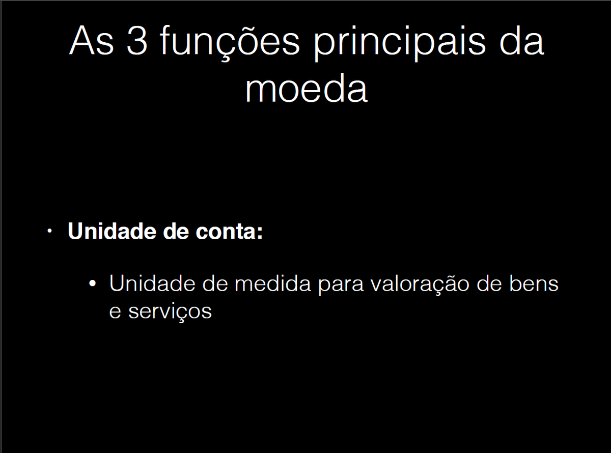 9) Funções principais da moeda. Na história já tivemos diversos tipos de moedas, e toda moeda procura atender essas 3 funções. Vamos comentar sobre cada uma, e ter em mente que nenhuma moeda atende 100% a cada função