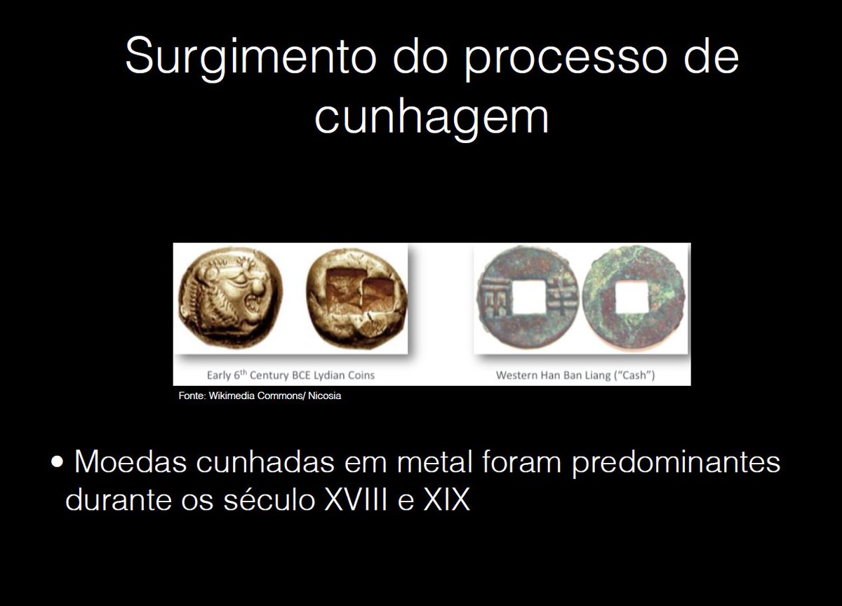 14) Após essas formas primitivas de dinheiro, nós tivemos o surgimento do processo de cunhagem, o que permitiu o surgimento de moedas parecidas com a que temos hoje.