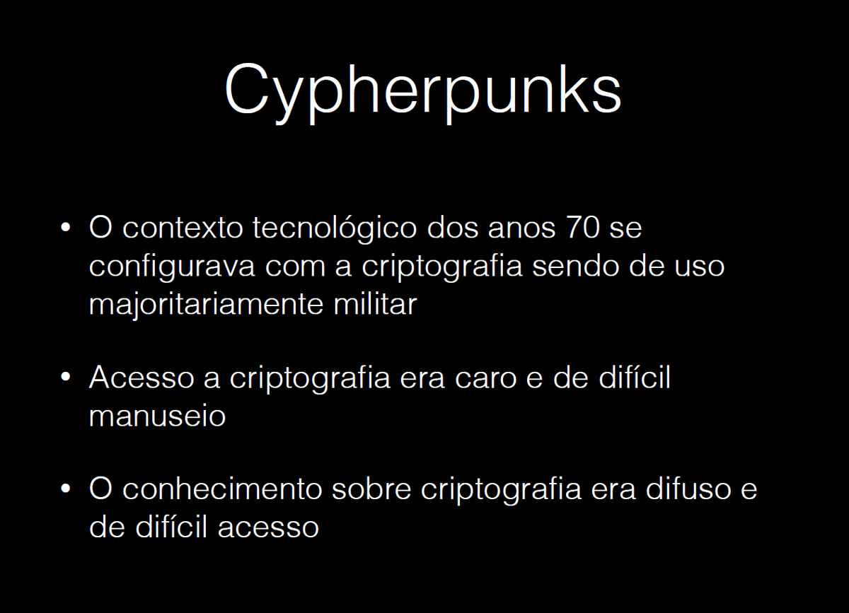18) Contexto de surgimento dos cypherpunks. Os primeiros membros apareceram já nos anos 70. Nessa época, a criptografia era considerada uma arma e de uso basicamente militar. Acesso a criptografia era caro, difícil de se mexer, e não tinha seu conhecimento difundido