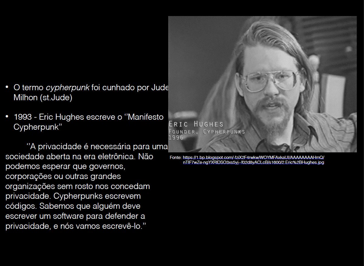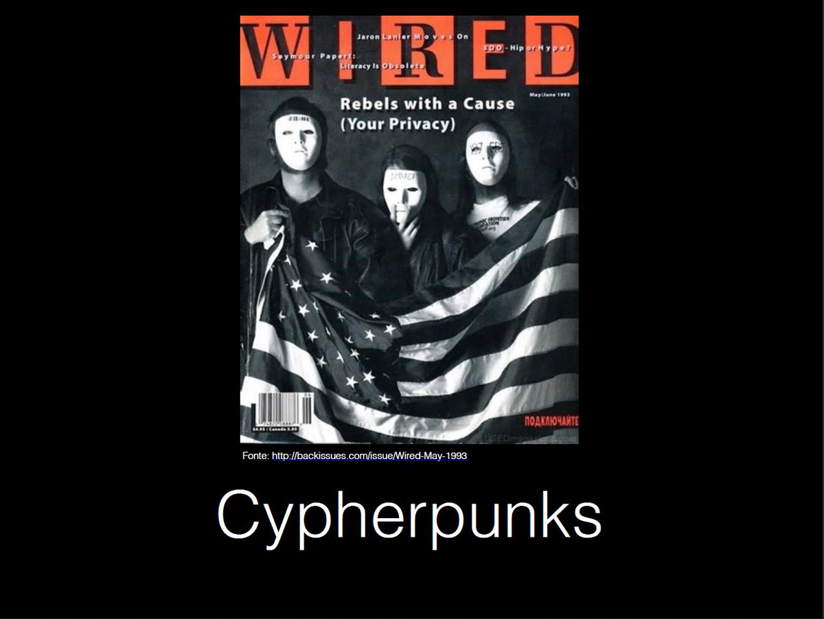 19) O termo cypherpunk foi desenvolvido por Jude Milhon (St. Jude). Em 93, o Manifesto Cypherpunk (sugiro ler), criando as bases do movimento: "transparência para os poderosos e privacidade pro povo". Muitos cypherpunks usavam pseudônimos e só foram descobertos recentemente