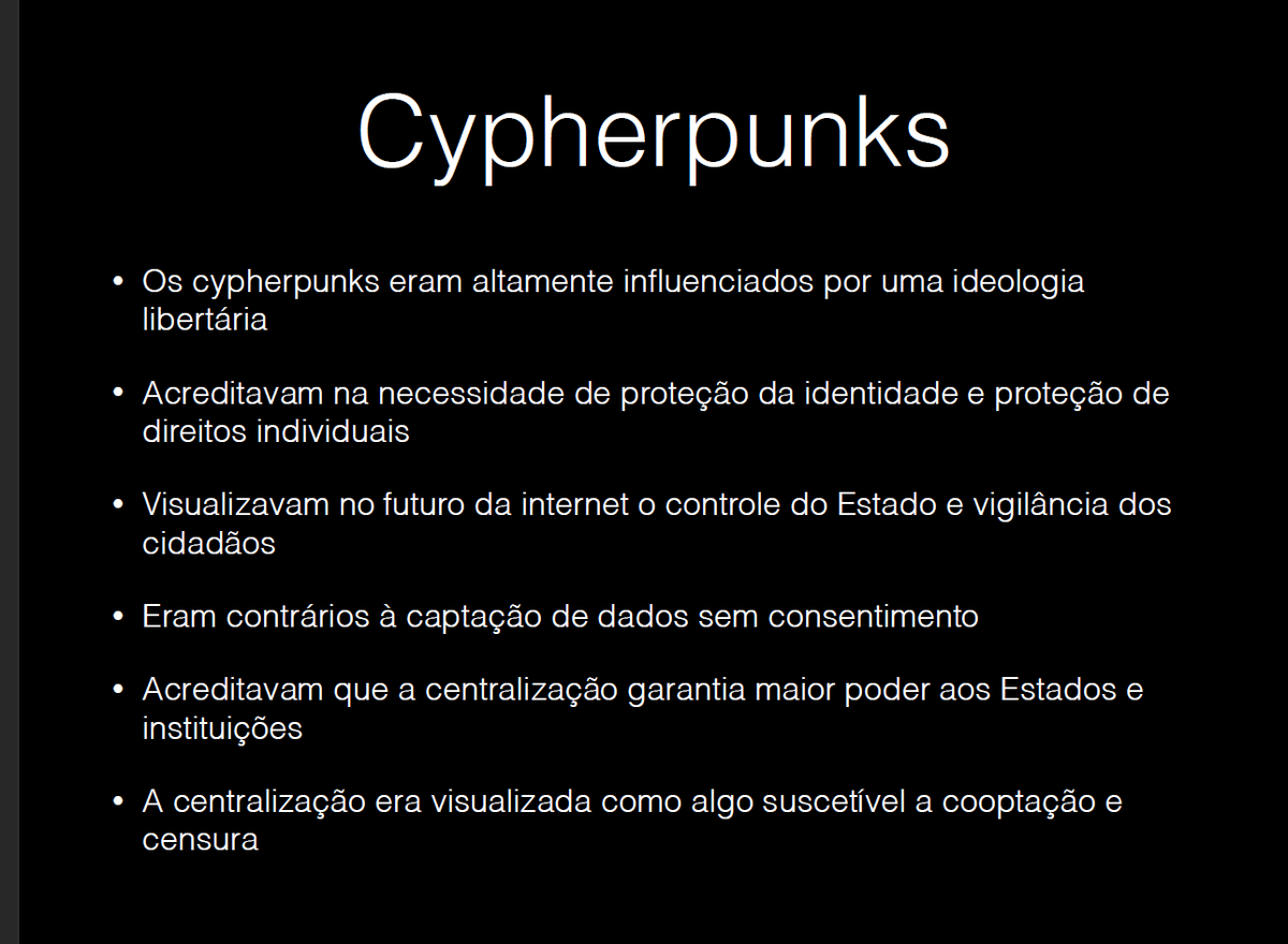 20) Cypherpunks eram fortemente influenciados por uma ideologia libertária. Acreditavam que no futuro da internet teríamos um Estado de Vigilância, e com cooptação de dados sem nosso consentimento (acho que acertaram kk). Defendiam os direitos individuais e a liberdade