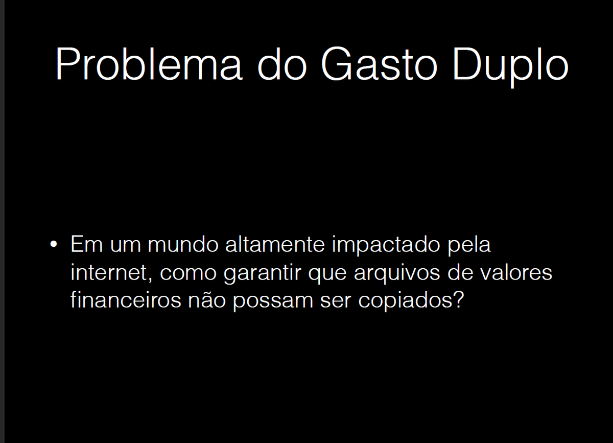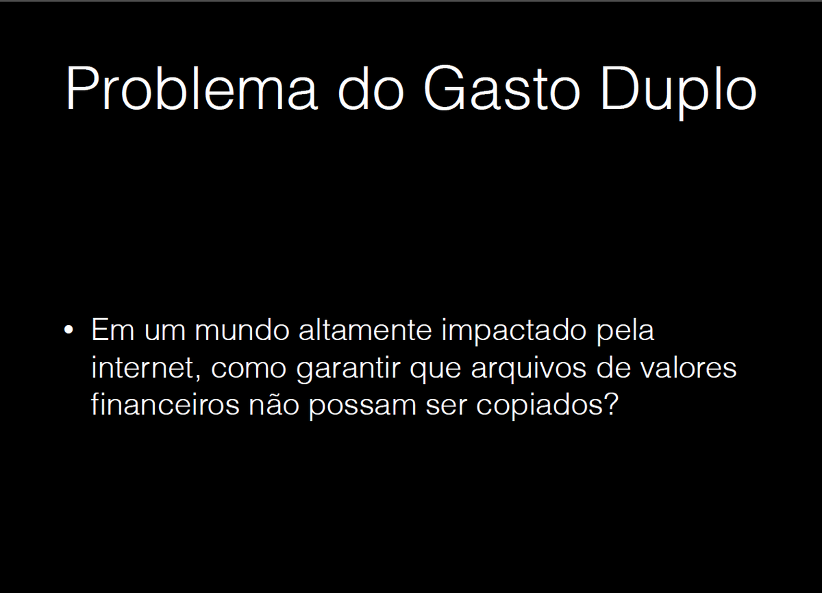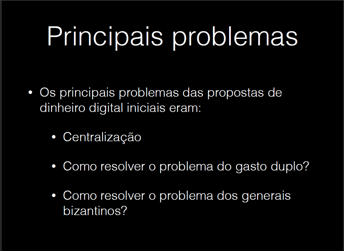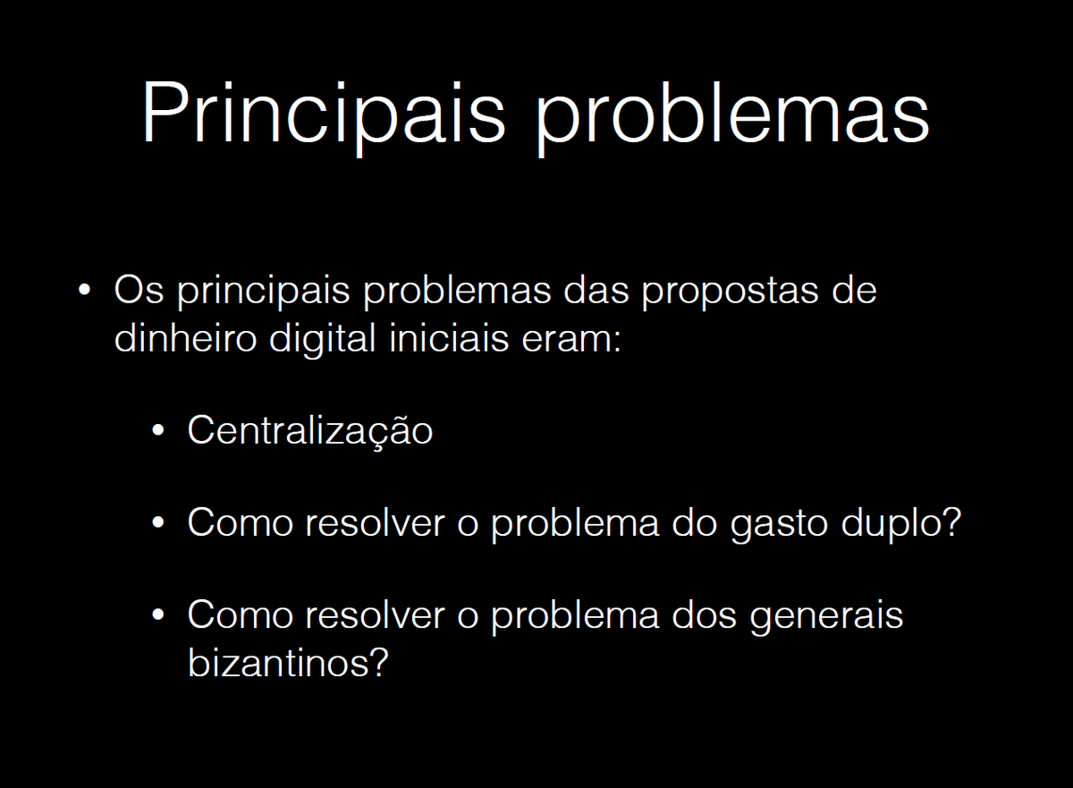 38) Voltamos aos principais problemas das soluções de dinheiro teletrônico anteriores ao Bitcoin. Lembrem-se: Gasto Duplo (cópias da unidade monetária) e Problema dos Generais Bizantinos (confiança em sistemas descentralizados)