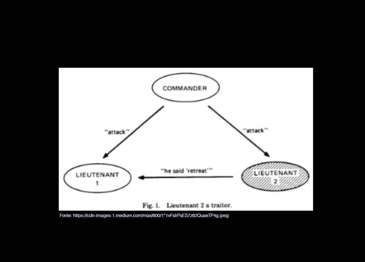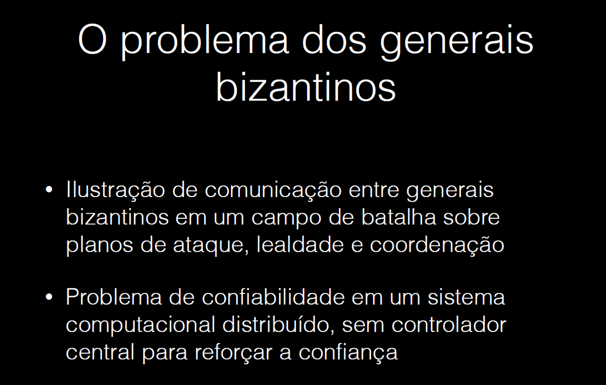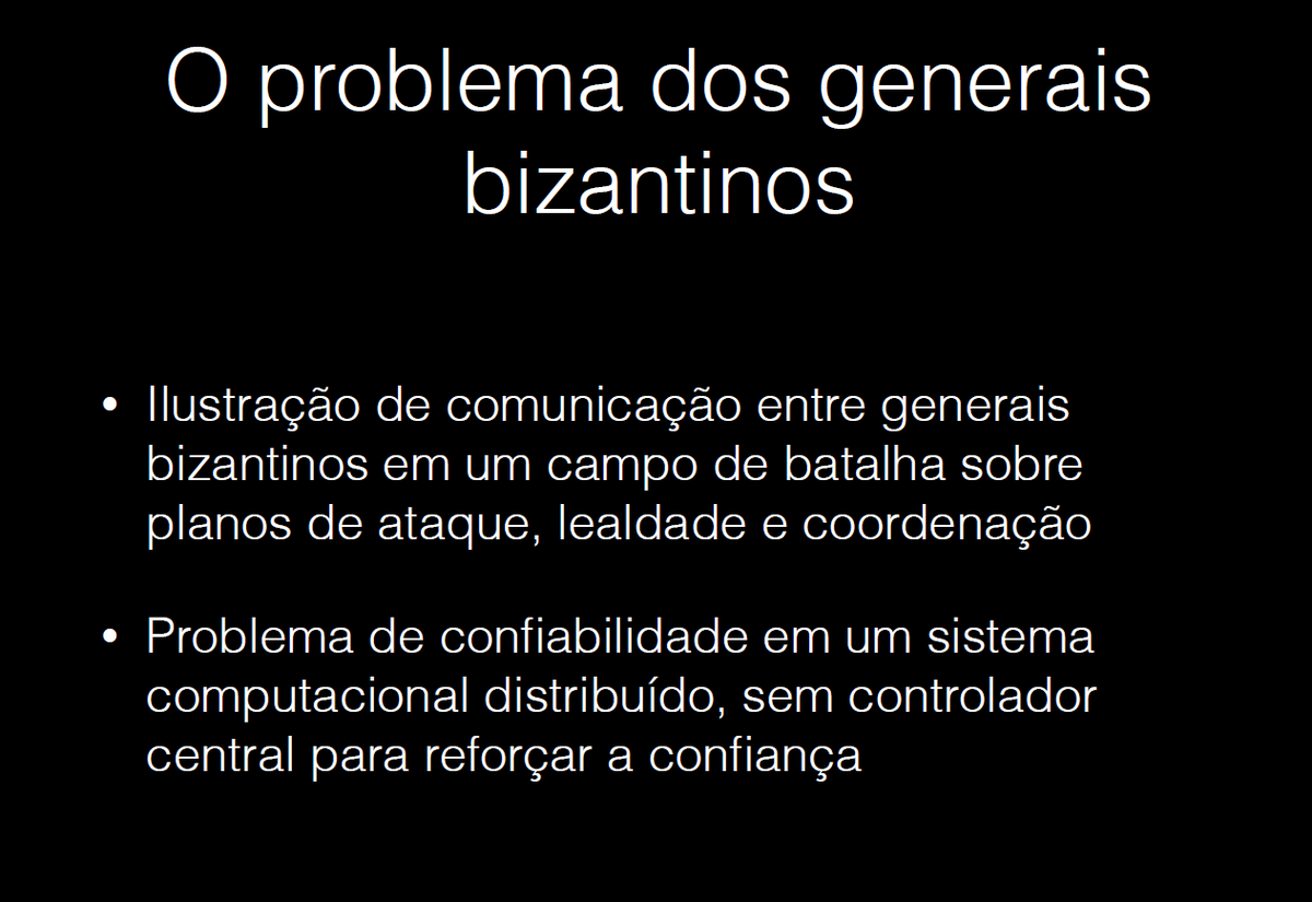 24) Outro problema de Teoria dos Jogos enfrentado é chamado de "Problema dos Generais Bizantinos". É um jogo informacional em que, caso se tenha descentralização, como gerar mecanismos de confiança sem um controlador central pra validar a informação?