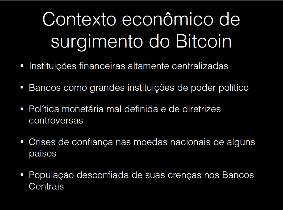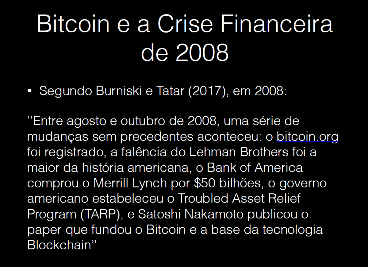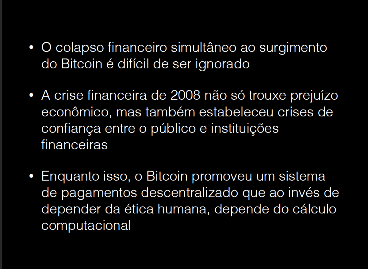 27) Sem querer entrar muito no mérito, mas devemos lembrar que a Crise de 2008 estabeleceu não só uma crise financeira, mas também de confiança. O surgimento do Bitcoin possibilitou um sistema de pagamentos cuja confiança dependia de um cáclulo computacional e não da ética humana