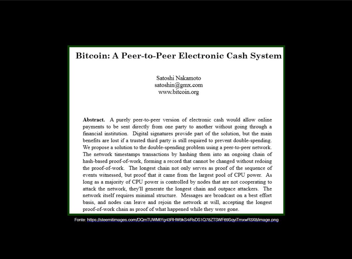 28) E agora temos o "grande evento". Em 31 de outubro de 2008, o pseudônimo Satoshi Nakamoto envia para a lista de email dos cypher punks o artigo " Bitcoin: A peer-to-peer electronic cash system"
