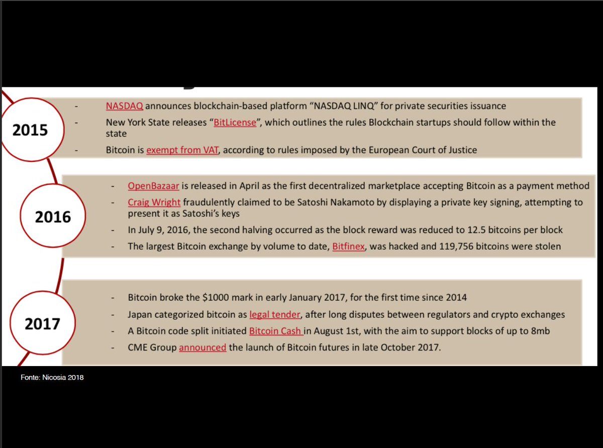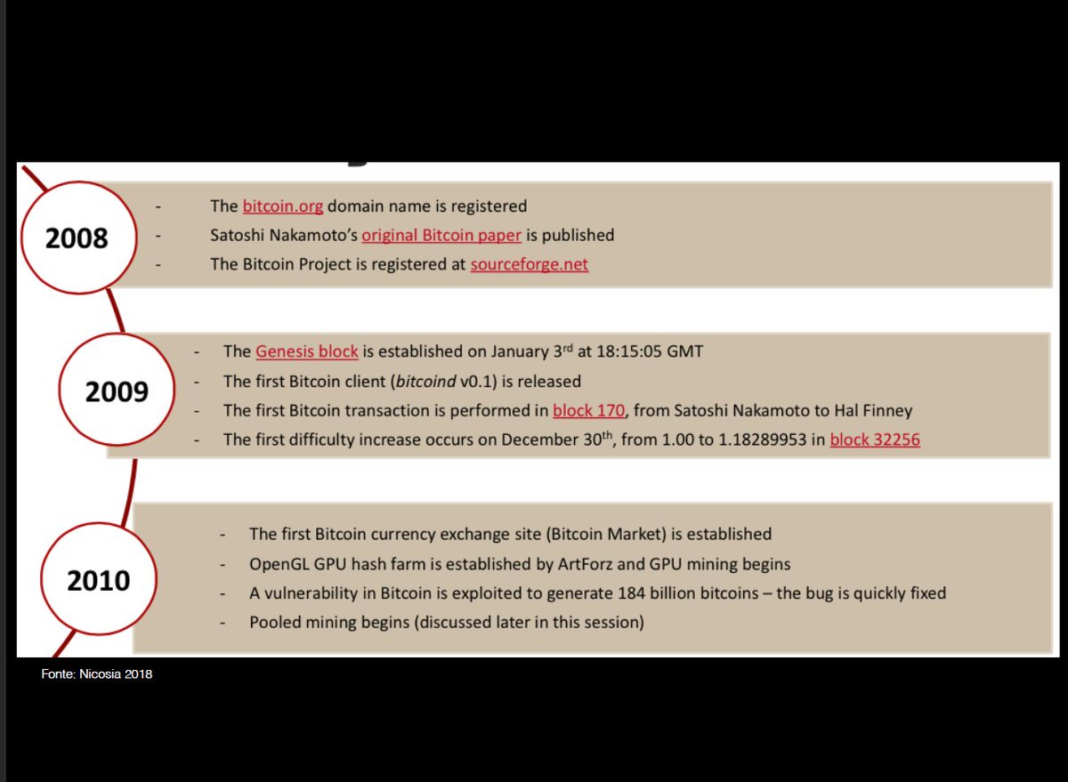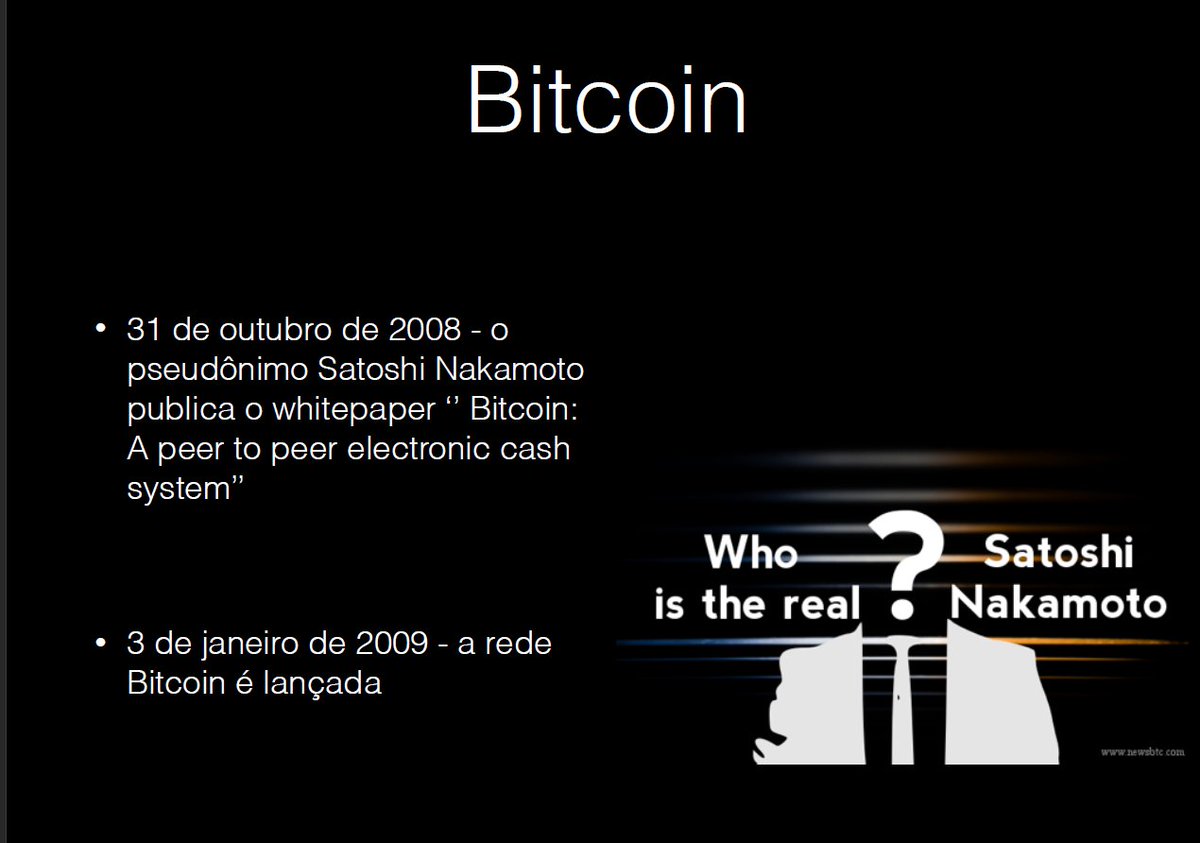 29) Na linha do tempo, 31 de outubro de 2008 temos o surgimento do paper que cria o Bitcoin, e em 3 de janeiro de 2009 temos o lançamento da rede Bitcoin. Importante destacar que até hoje não se sabe quem é Satoshi Nakamoto