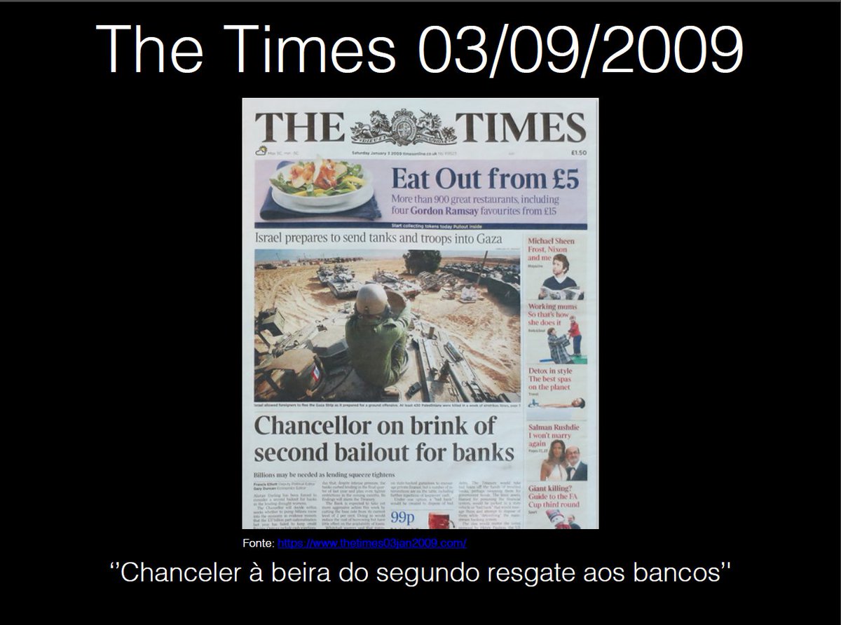 5) The Times 03/09/2009. Essa foi a mensagem deixada no primeiro bloco minerado da rede Bitcoin. Deixo aqui a provocação e já antecipo que o surgimento do Bitcoin está diretamente ligado à Crise Financeira de 2008