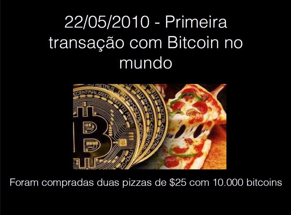 31) Outro fato curioso é que a primeira transação com Bitcoin ( para compra de alguma coisa) aconteceu em 22/05/2010. Foram compradas duas pizzas por 10.000 btcs (cerca de 1 bilhão e 440 milhões de reais na cotação atual). Até hoje o dia 22/05 é comemorado como Bitcoin Pizza Day