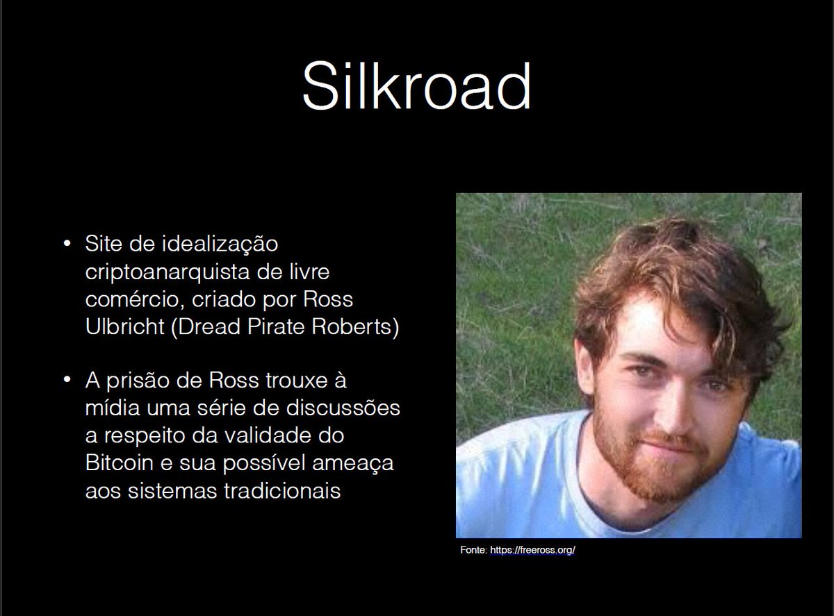 34) O debate público sobre Bitcoin aconteceu depois da prisão de Dread Pirate Roberts (Ross Ulbricht). O site Silkroad da deep web pregava o livre comércio de trocas voluntárias, altamente ideológico, e que comercializava de tudo (incluindo drogas). A moeda utilizada era bitcoin