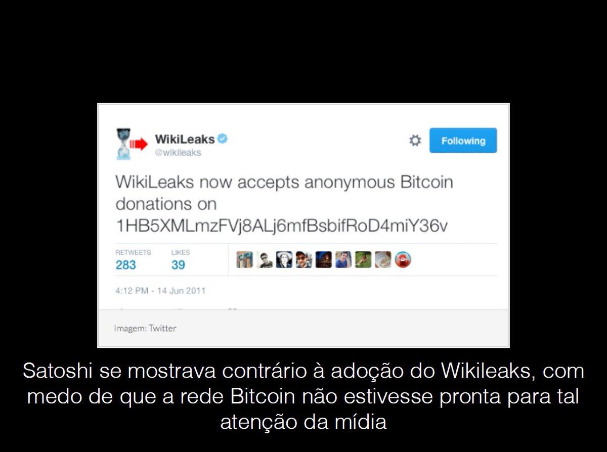 35) A prisão de Ross Ulbricht foi declaradamente um julgamente sobre a utilização do Bitcoin. Outro fato que trouxe notoriedade foi quando site Wikileaks teve seus meios de pagamento cortados, e passou a adotar o bitcoin como forma de doação. Satoshi era contra essa exposição