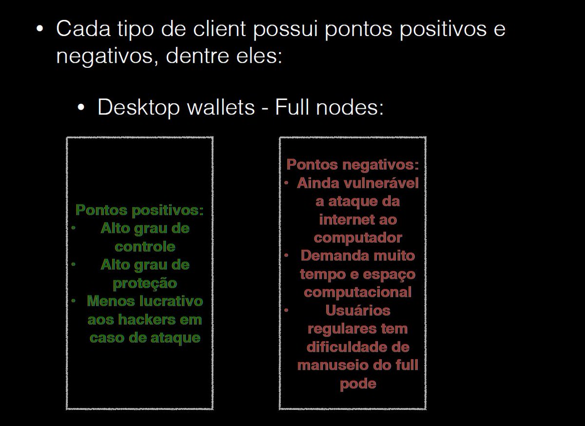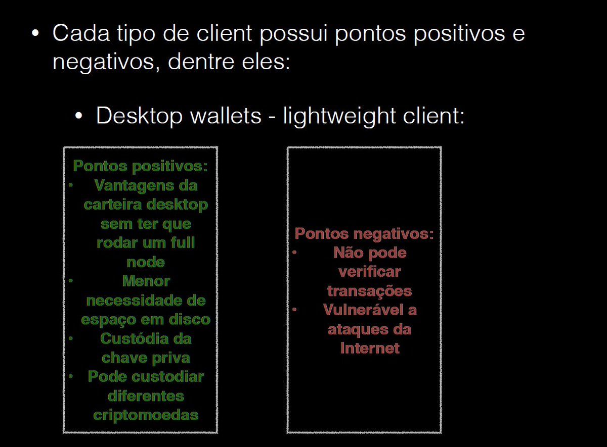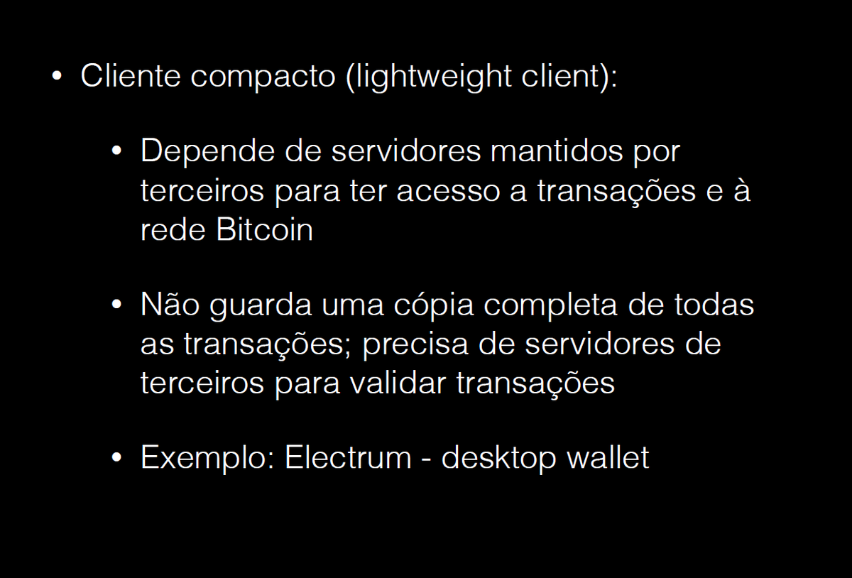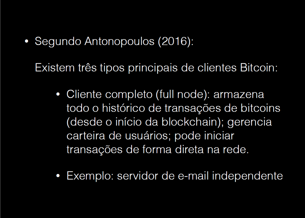 41) Antes de explicar o funcionamento, quero falar sobre Clients Bitcoin. Formas do usuário acessar o blockchain. A principal, e proposta original são as de Full Node (nó da rede), temos também lightweight client, web client, e mobile client