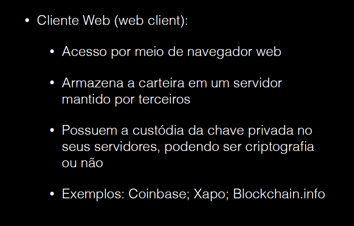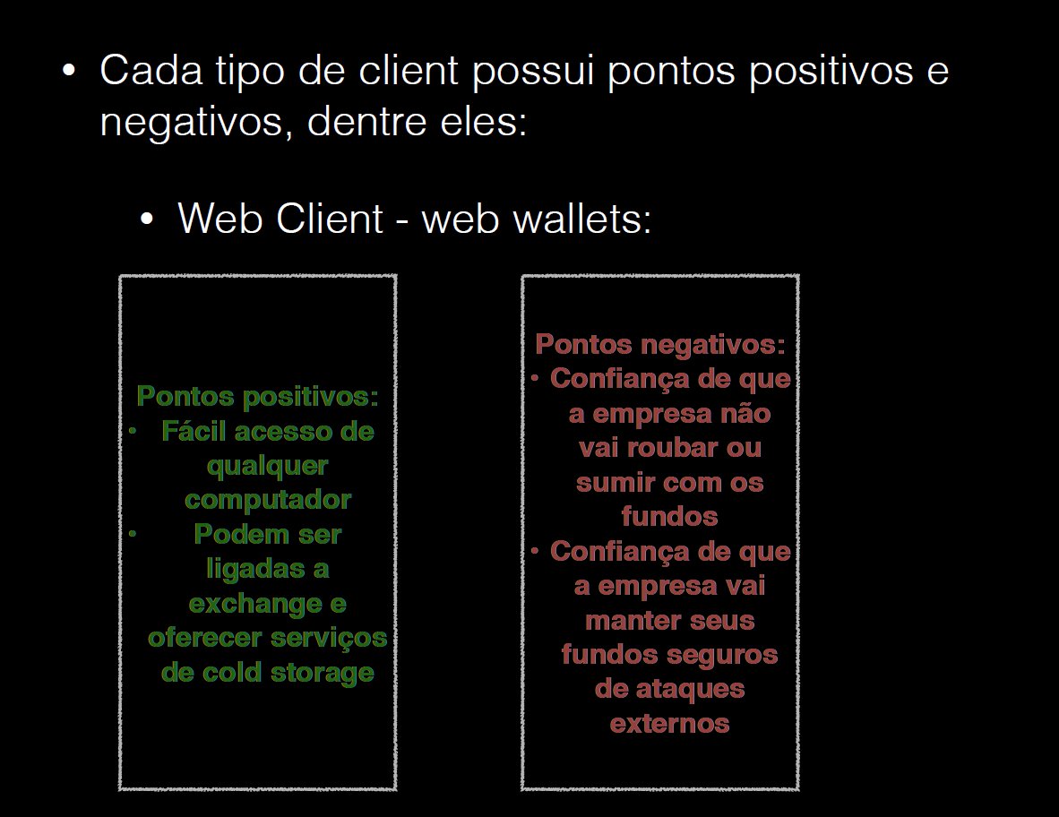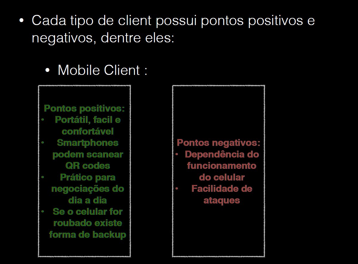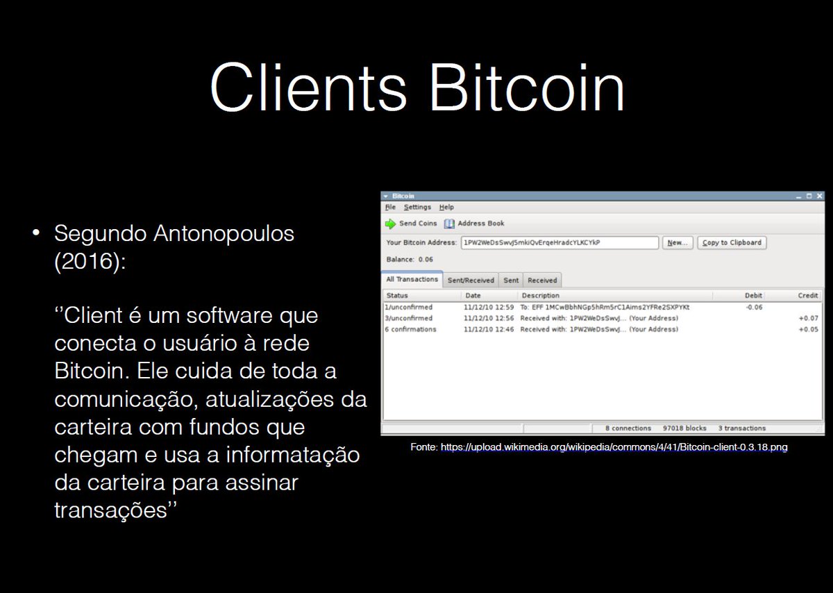 41) Antes de explicar o funcionamento, quero falar sobre Clients Bitcoin. Formas do usuário acessar o blockchain. A principal, e proposta original são as de Full Node (nó da rede), temos também lightweight client, web client, e mobile client