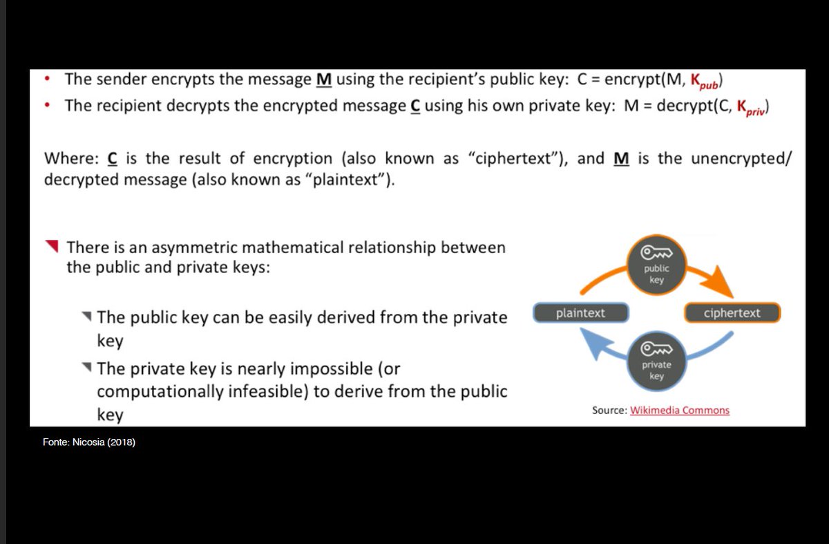 46) Criptografia de Chave Pública. É um formato de criptografia em que se tem uma chave privada e uma pública. A chave privada deve sempre ser mantida em sigilo e faz a assinatura digital das transações. A chave pública é aquela que é divulgada para as transações