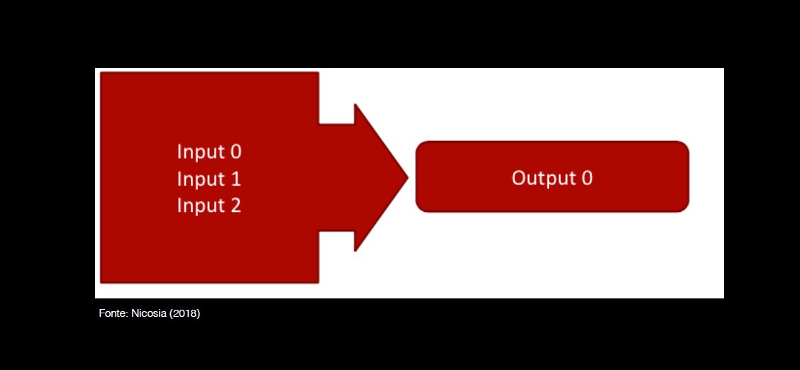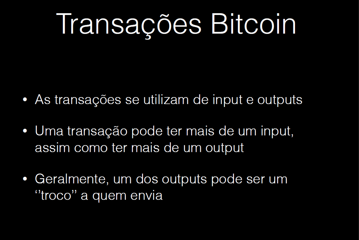 49) As transações Bitcoin utilizam inputs e outpus. Podem ter mais de um input ou output na mesma transação. As carteiras que temos online hoje basicamente agregam inputs quando vamos transferir.
