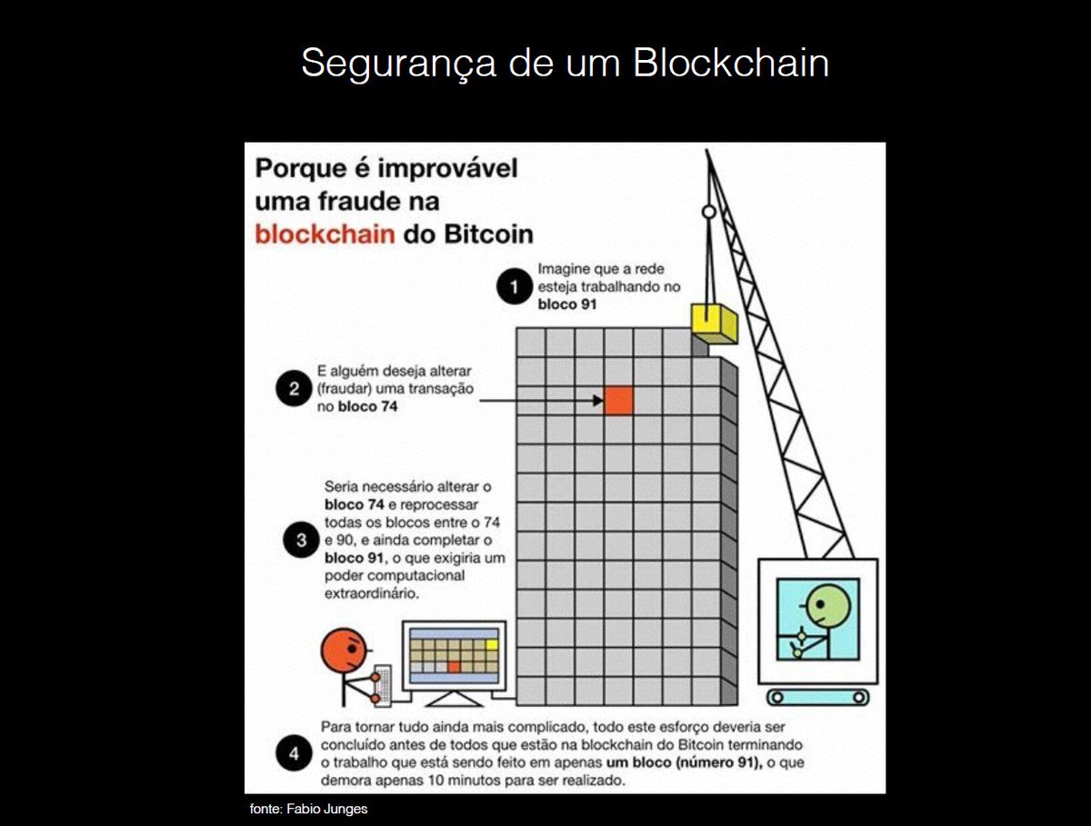52) Segurança, funcionamento, e aplicabilidades de Blockchain (desenho por Fabio Junges). No Brasil, o maior projeto que existe de aplicação de Blockchain é o do @eddieoz chamado @OriginalMyCom . Esse cara é um gênio e vale pesquisar suas entrevistas