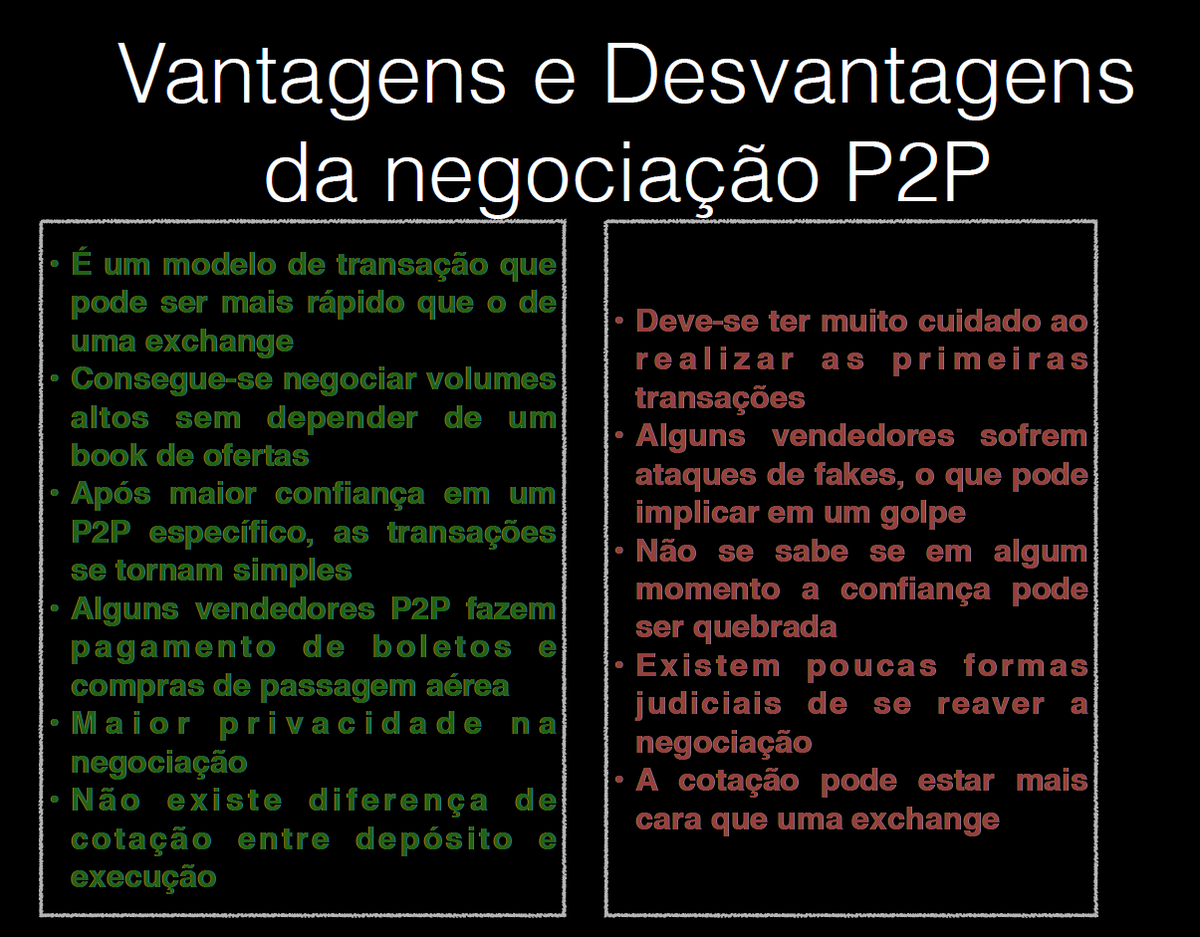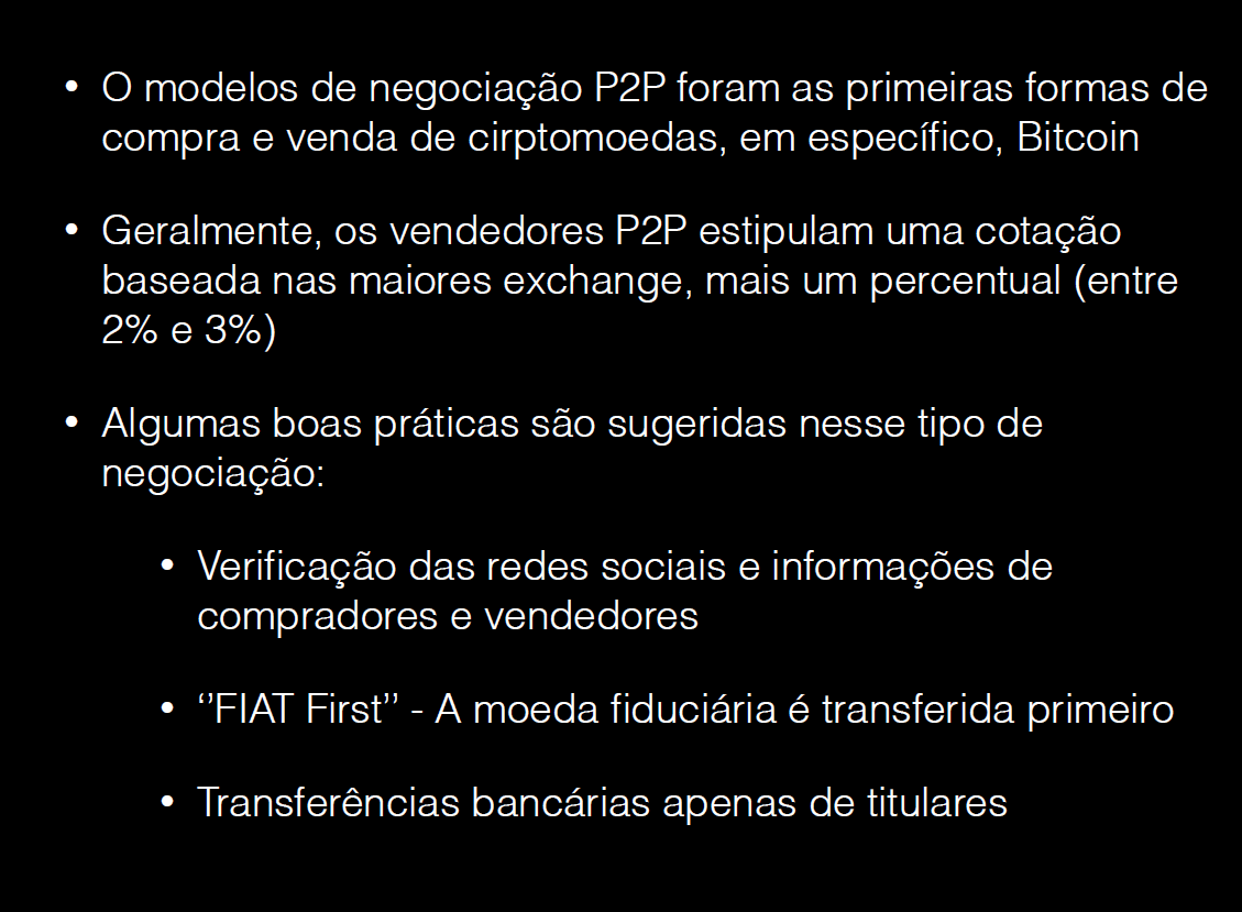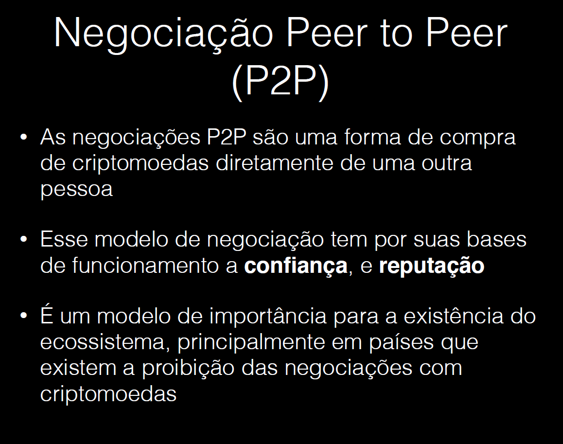 58) As duas principais formas de negociação são em Peer to Peer (P2P) e por exchanges (corretoras). Vamos primeiro de P2P. É um modelo baseado em confiança e reputação. Antigo, mas importante para países que enfrentam proibições do BTC, ditaduras, e crises financeiras.