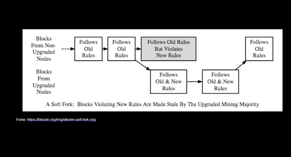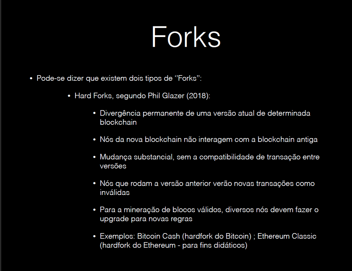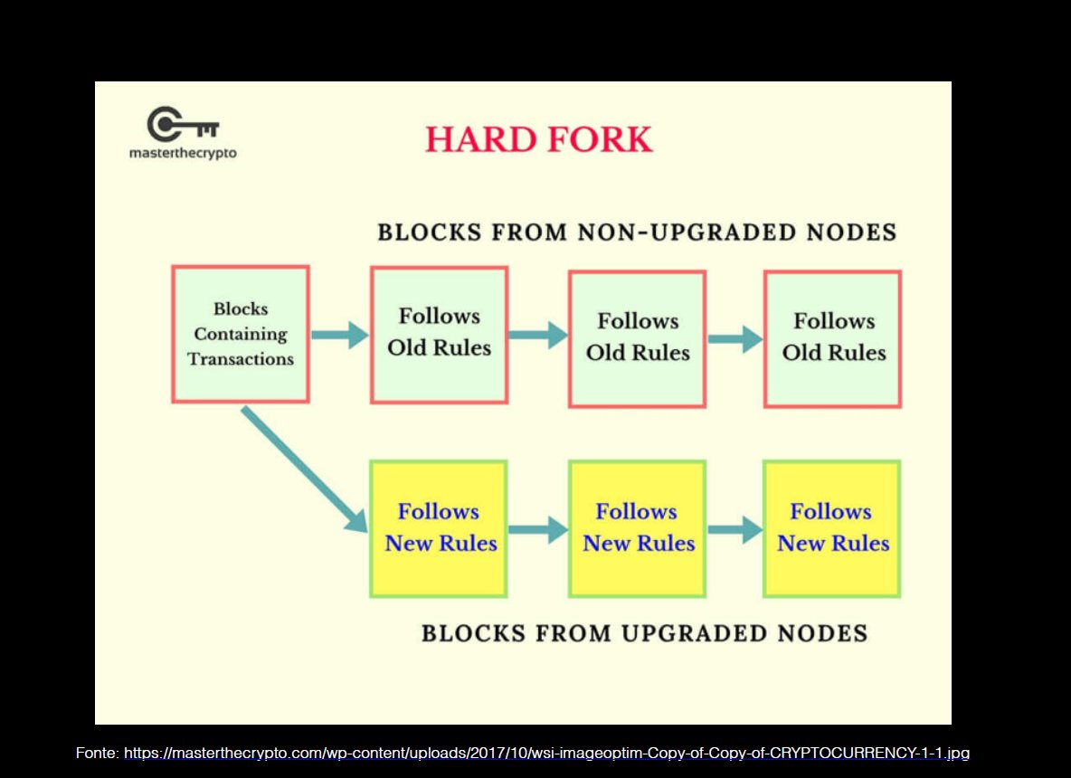 64) Forks. São divisões dentro de um sistema de criptomoedas, que podem originar novas criptomoedas. Geralmente acontece quando não existe consenso sobre determinada regra entre os desenvolvedores. Muitas criptos surgiram por meio de forks de criptomoedas anteriores. Soft ou Hard