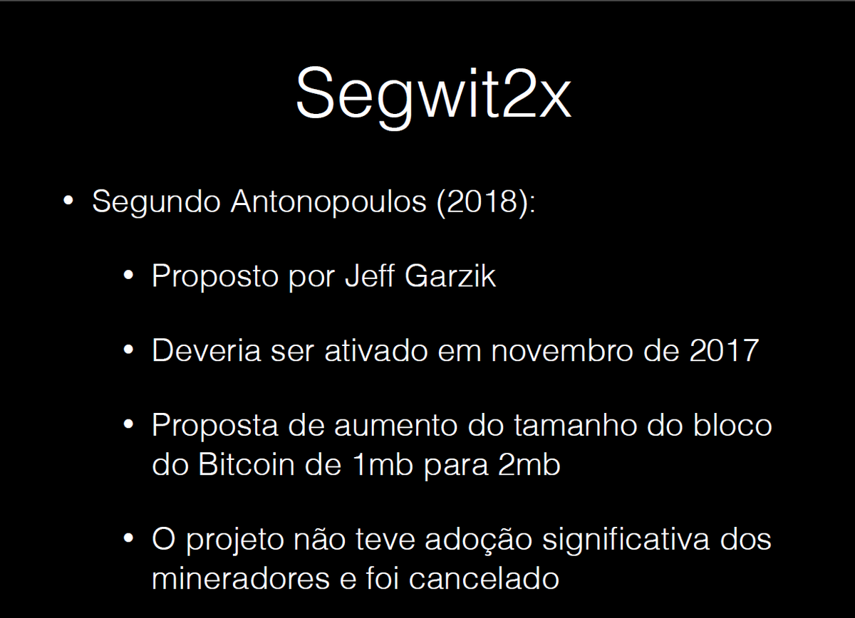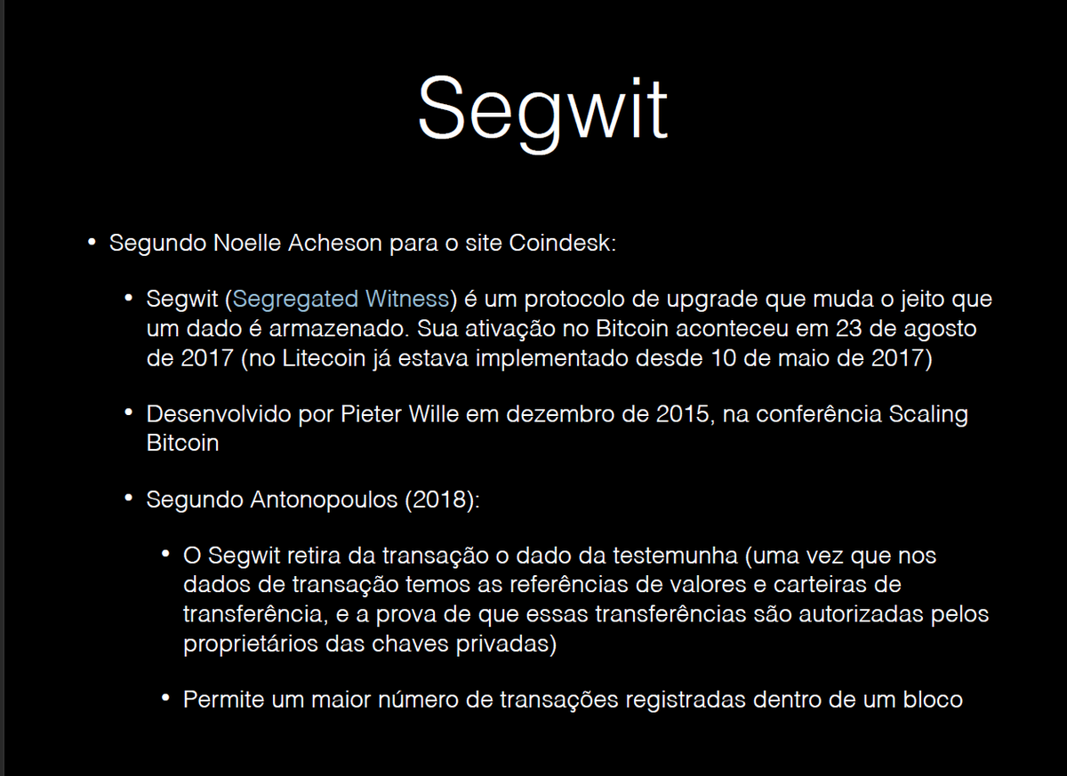 65) Segwit e Segwit2X. Segregated Witness. Protocolo de upgrade para a rede Bitcoin, e que foi responsável por um ganho de escalabilidade do Blockchain do Bitcoin
