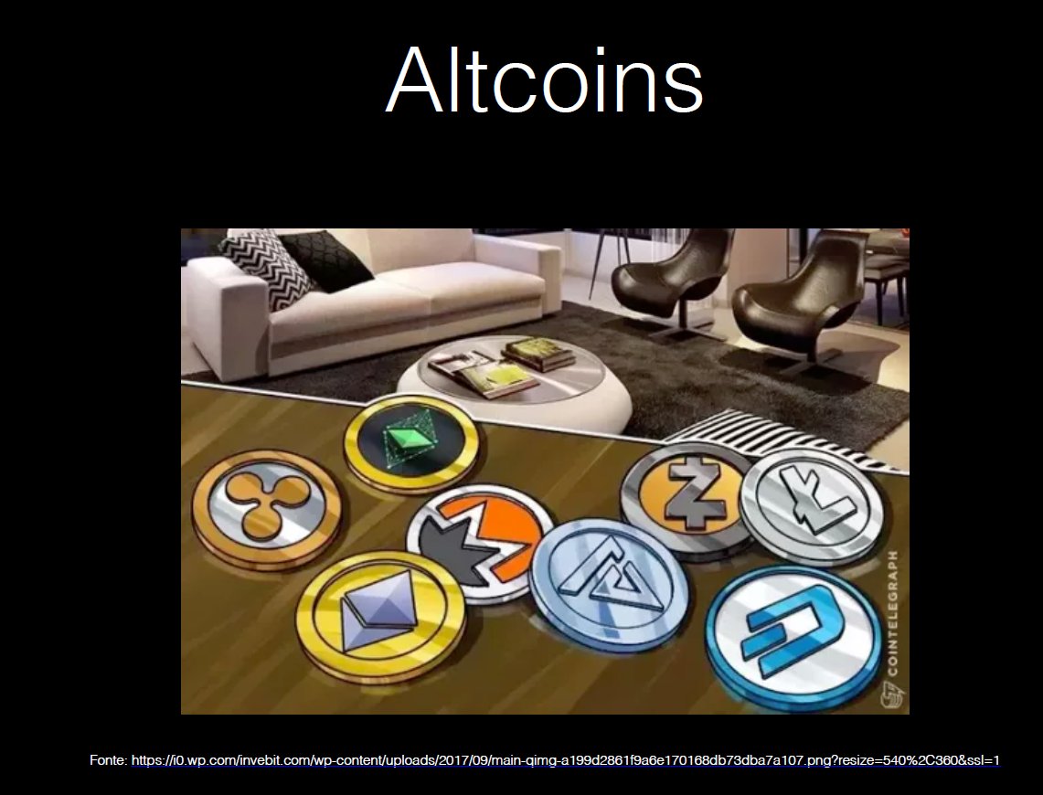66) Altcoins. São as outras criptomoedas além do Bitcoin. É importante ressaltar que em 2017 tivemos um boom delas. Eu mesmo tinha um portfólio com cerca de 7 criptomoedas. Só o Bitcoin sobreviveu. De qualquer maneira, são propostas a serem estudadas para o futuro