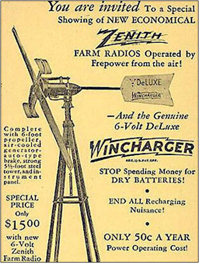 *Wincharger (founded 1927) was way ahead of the curve, sustainable energy-wise. Wincharger windmills generated electricity, and very popular with farm families pre-rural electrification, especially for listening to the radio. My grandparents used one until 1946.