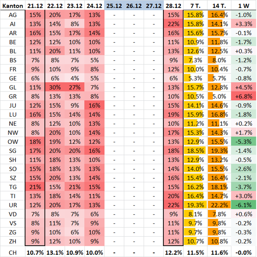 Veränd. in Prozent der Anz. Fälle pro Kanton in 1 Woche zur Vorwoche: