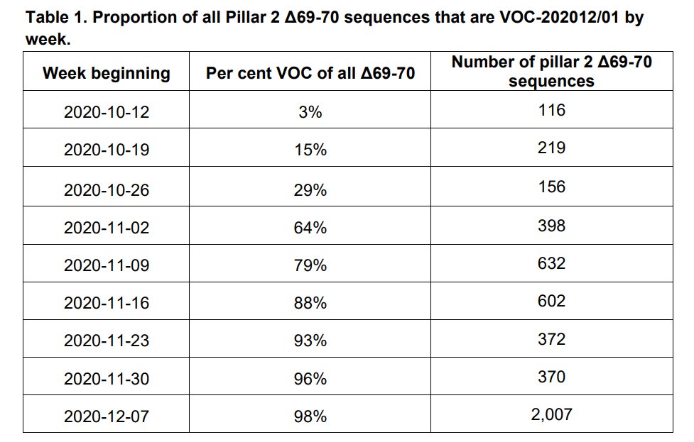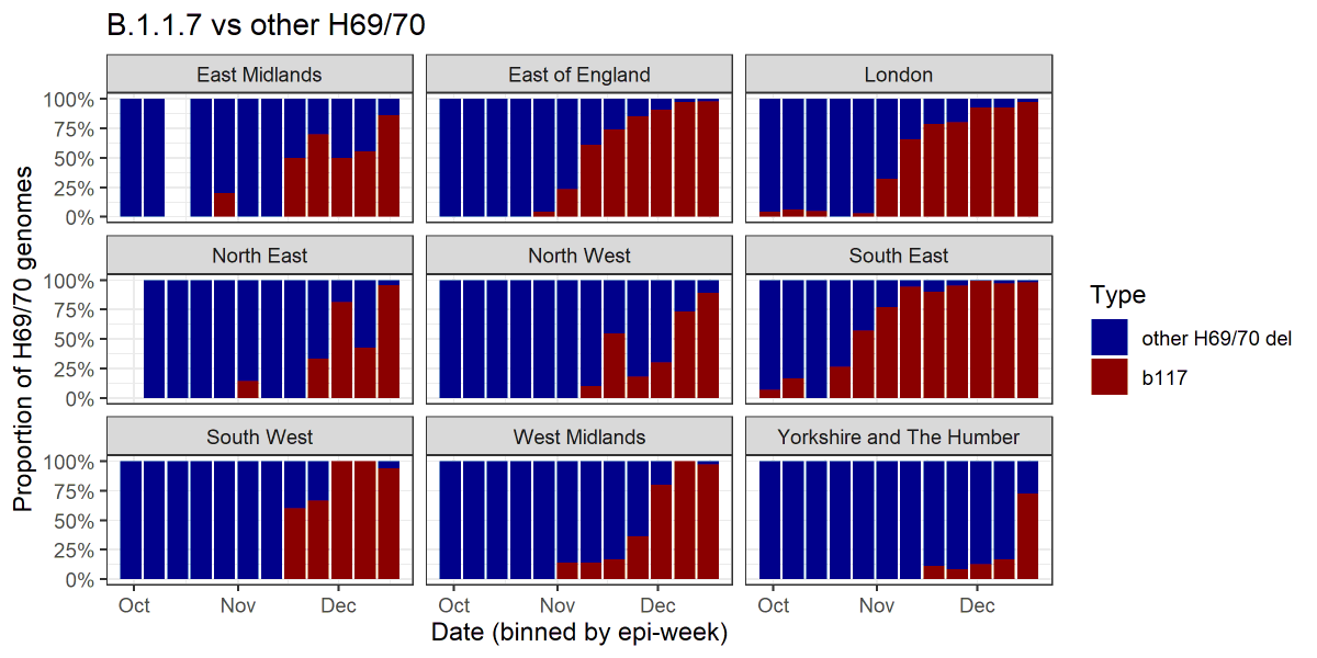 4/ We can also look at just the H69/70 deletion genomes and see what proportion of them are B.1.1.7.