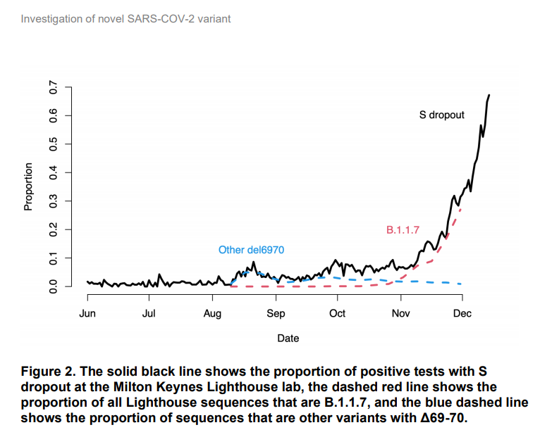 2/ B.1.1.7 has a deletion of 6 letters of RNA in the S gene, which happens to make one of the three PCR tests performed on each swab sample in the Lighthouse labs give a negative result. So these "S-negatives" can be a proxy for B.1.1.7.