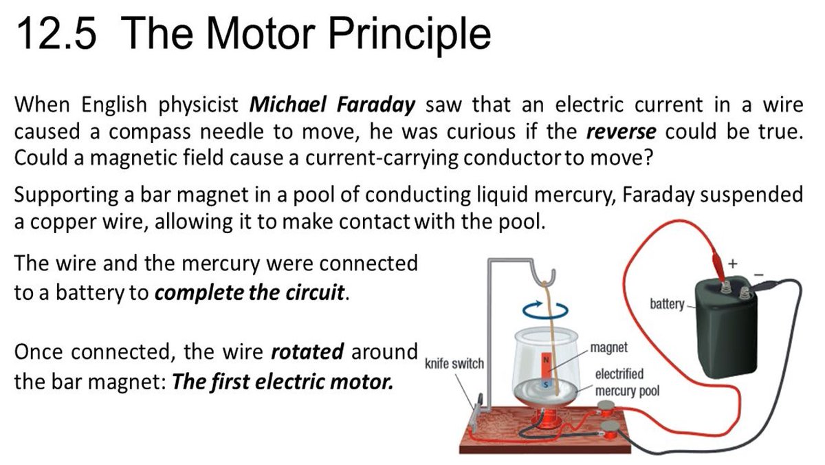 فیراڈے نے تامبے کی تار میں بجلی گزاری اور اور پنڈولم نما تار کو مرکری کے محلول میں لٹکا دیا. جیسے ہی بجلی کا سرکٹ مکمّل ہوا، وہ پینڈلم مرکری کے محلول میں گول گول گھومنے لگا. فیراڈے نے ثابت کر دیا کہ بجلی کی قوّت سے کام کروایا جا سکتا ہے. دنیا کی پہلی موٹر ایسی تھی.